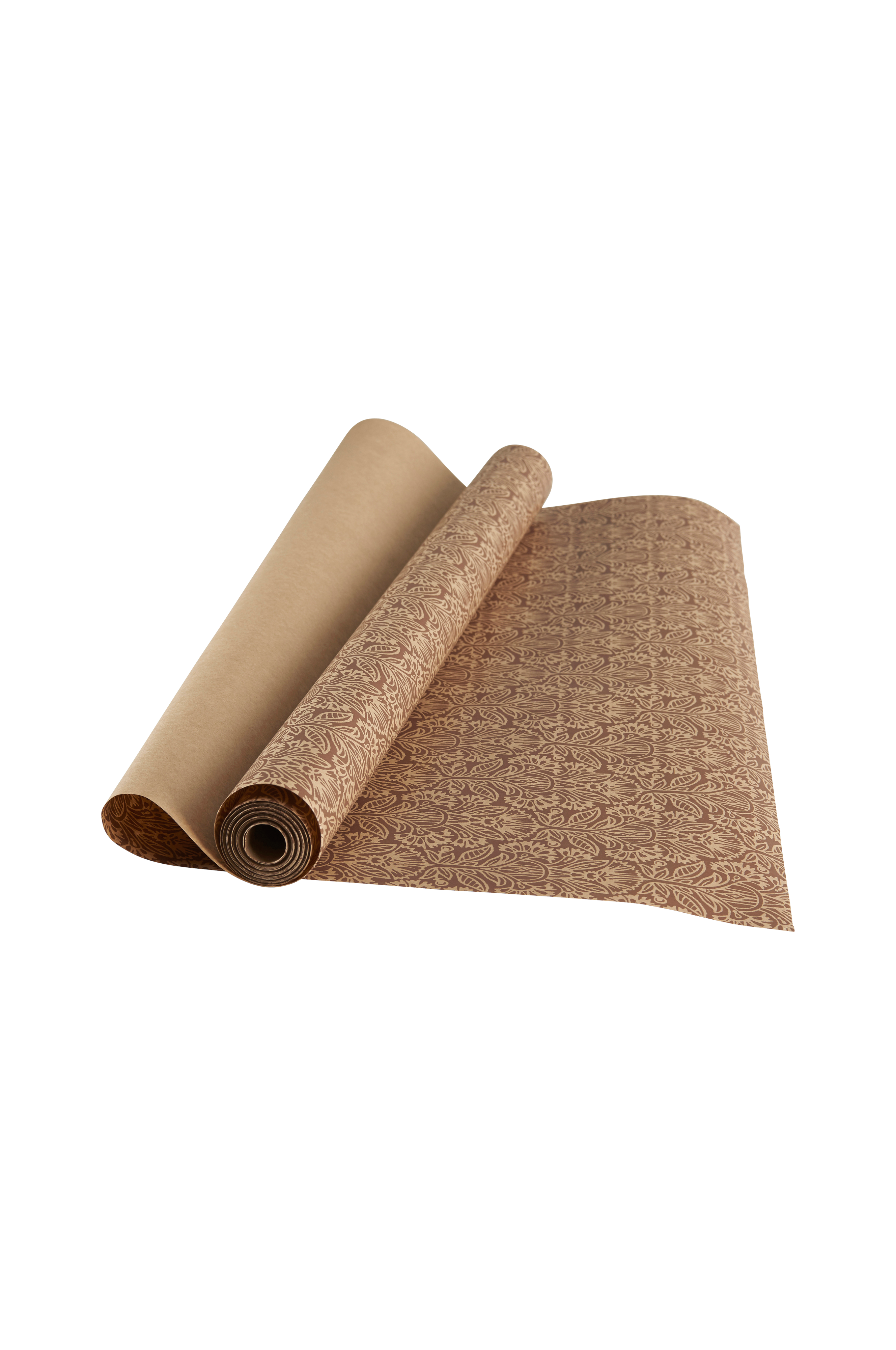 Printet, mønstret mat brunt papir i kraftig kvalitet. 80 g. Bredde 57 cm. Længde pr. rulle 10 meter.