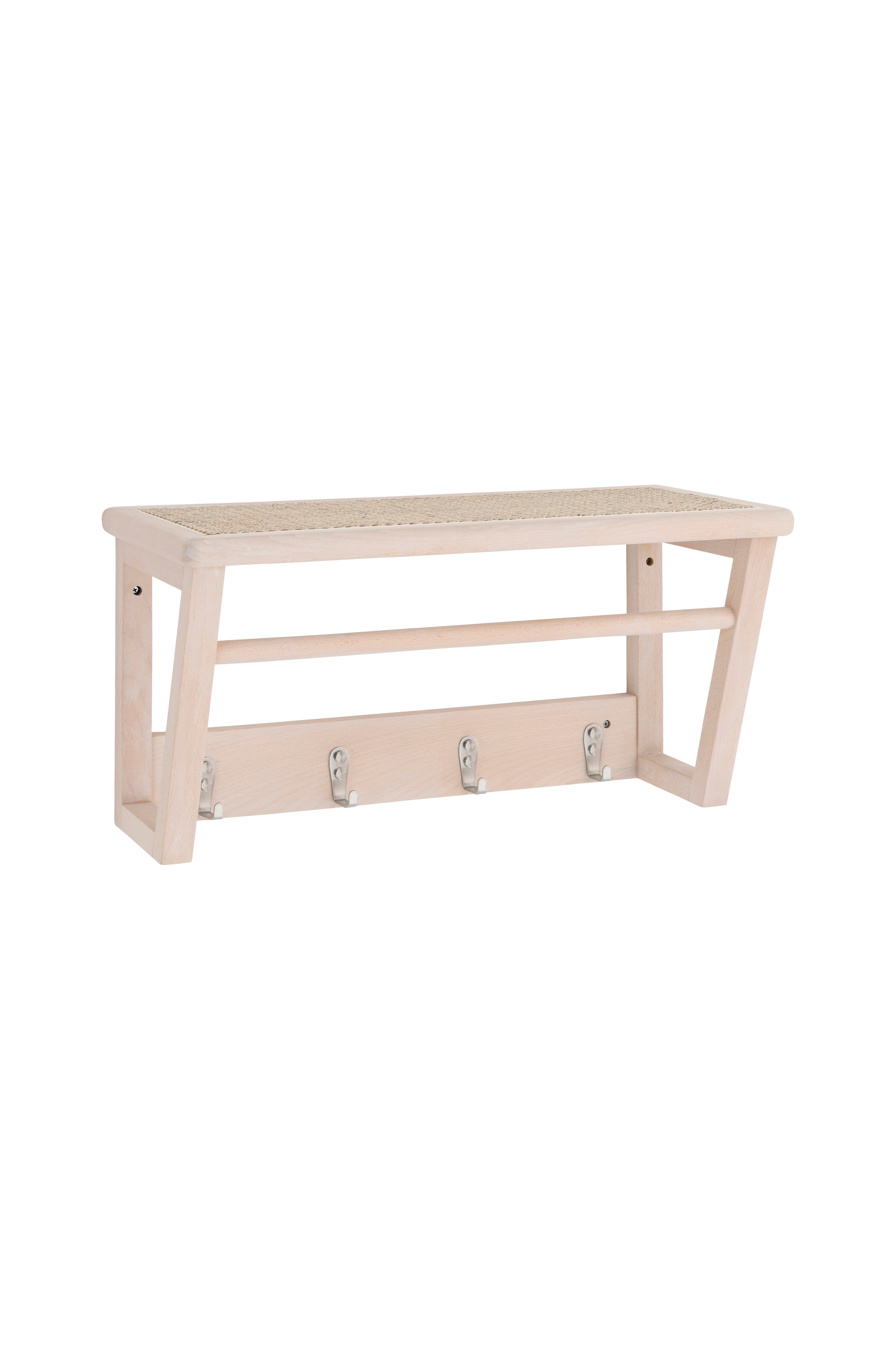 Hattehylde i massiv, hvidlaseret bøg og naturrotting. 4 knager i metal.