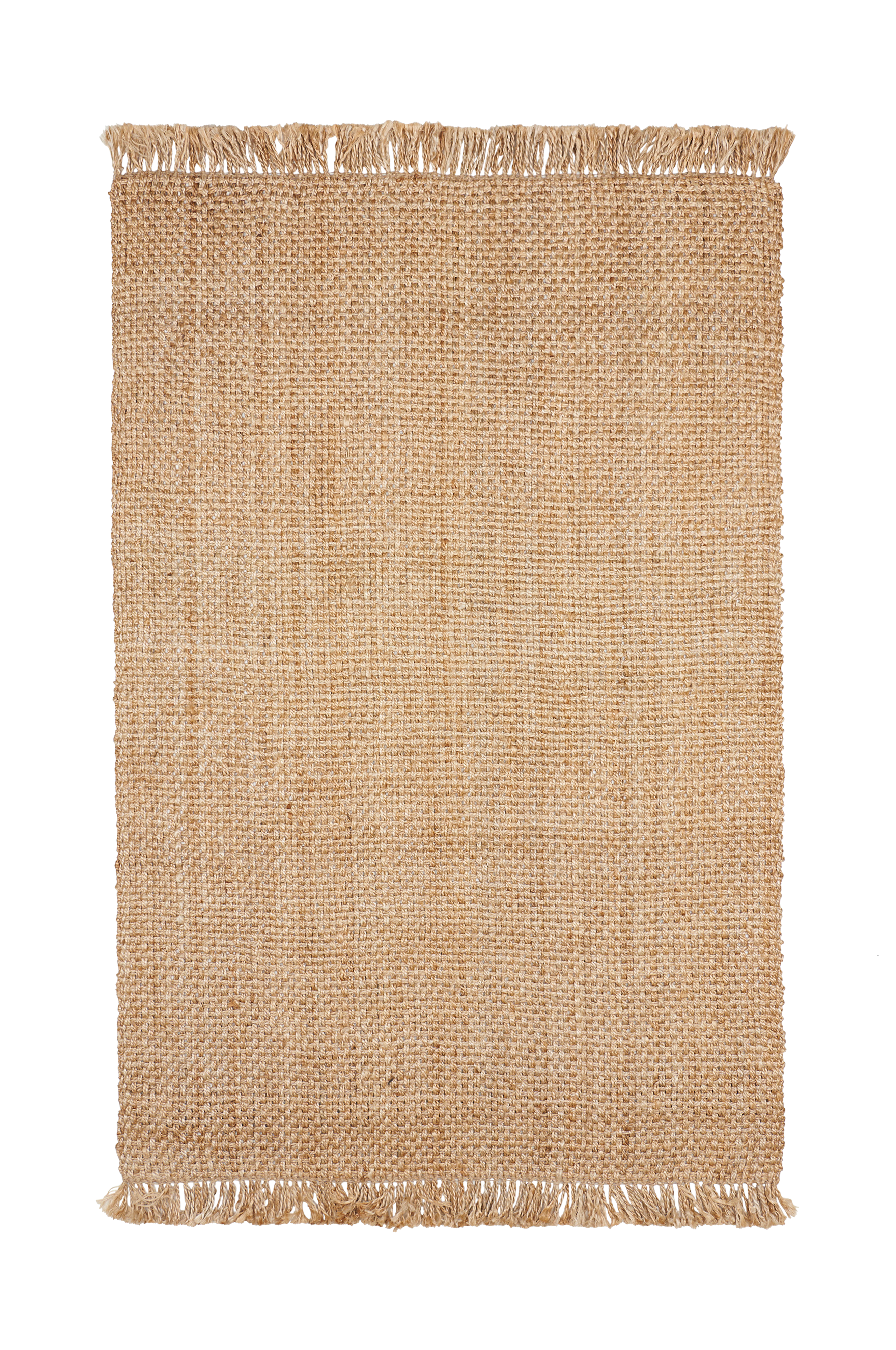 Tyndt vævet tæppe i 100% jute med snoede fibre. Lange frynser i enderne.