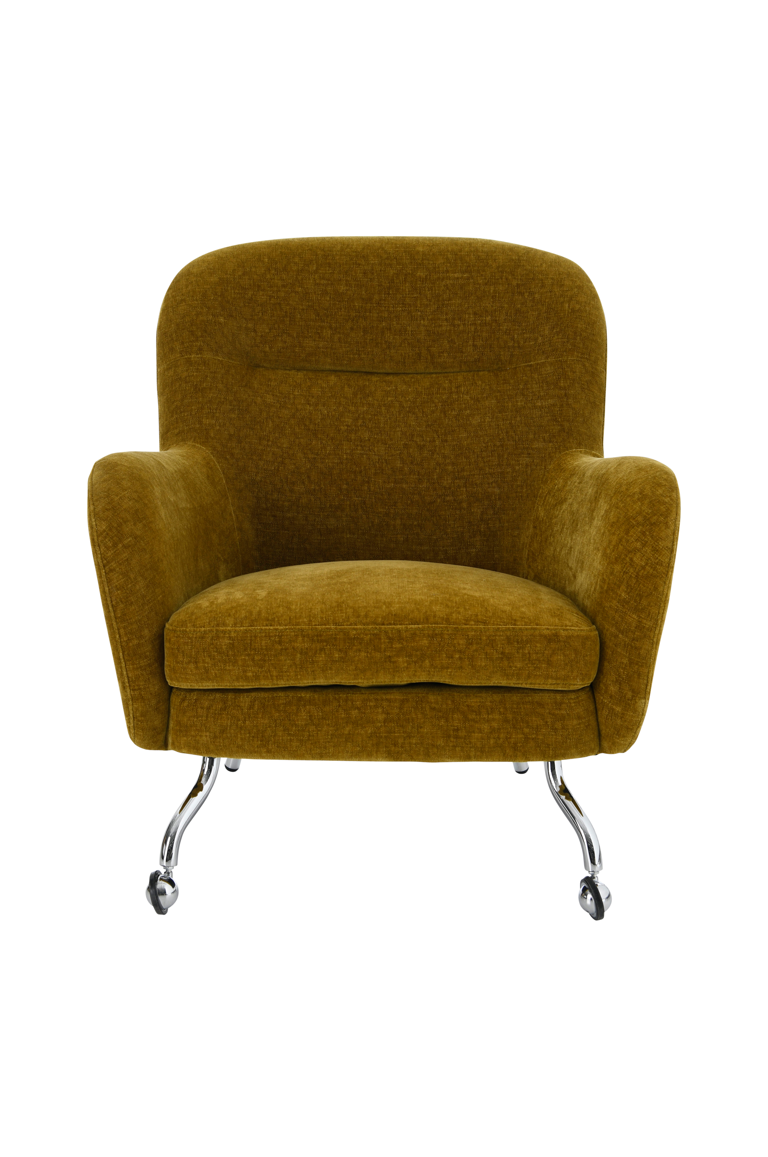 Lænestol med hjul på de forreste ben. Betræk i vasket velour. Stel af massivt træ og plywood. Nozagaffjedring og skumfyld. Ben af forkromet metal. Frihøjde under møbel 19 cm. Maks. vægt 100 kg.