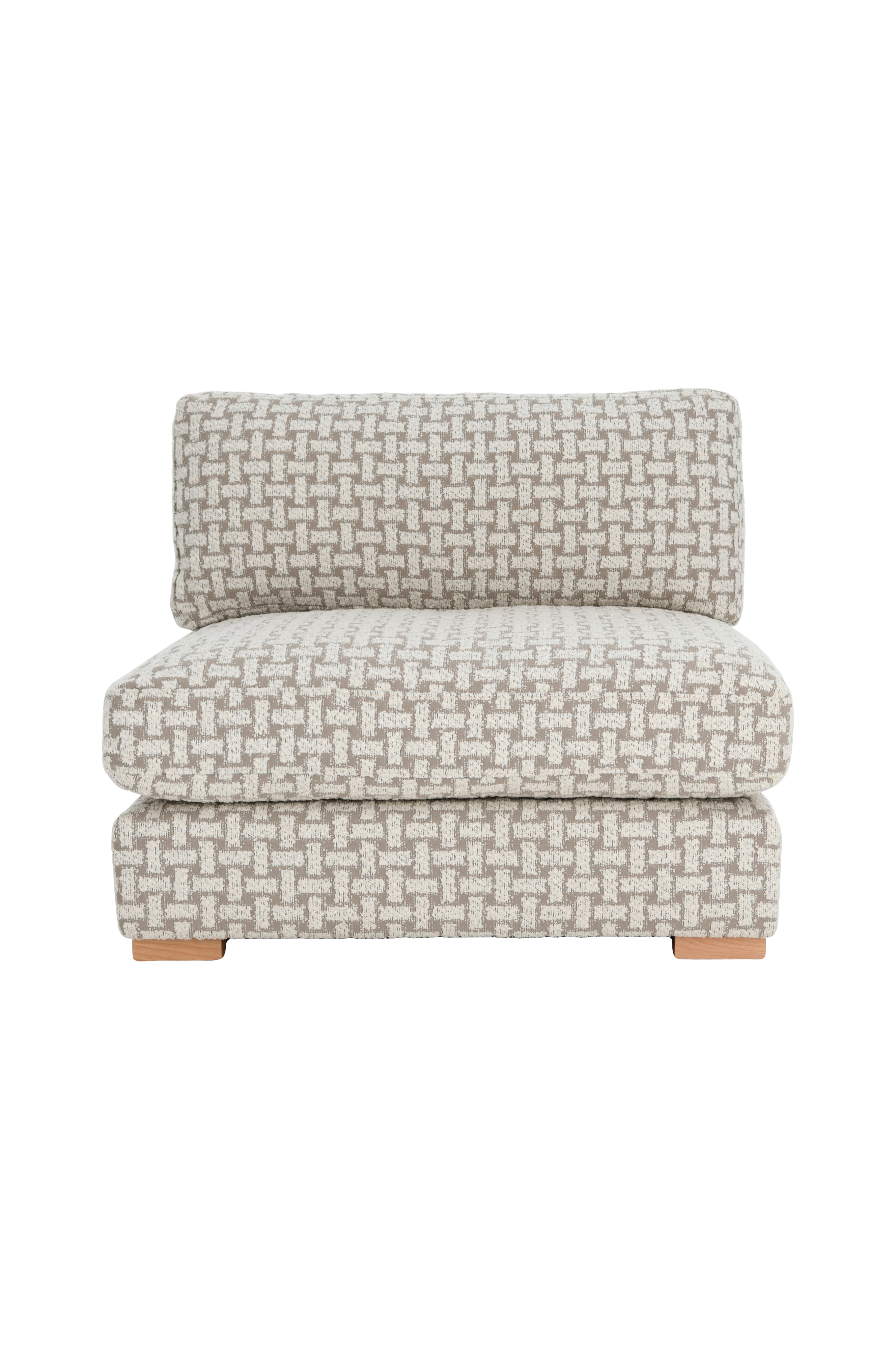 Lænestol i moderne design med stel i fyrretræ og plywood. Skumfyld i siddehynden samt fiber- og fjedre i ryghynden for ekstra komfort. Mønstret betræk af 90% polyester og 10% bomuld. Aftageligt betræk på hynderne. Frihøjde under møbel 3 cm.