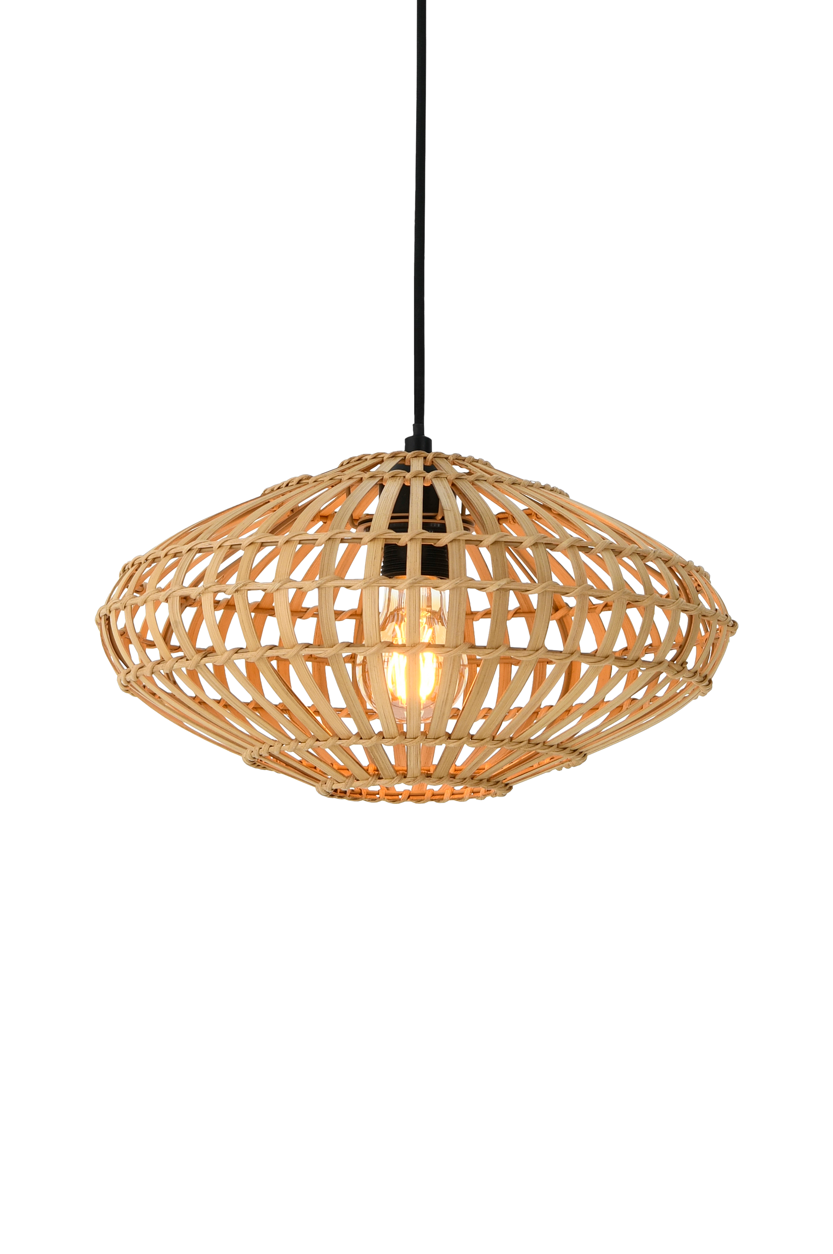 Loftlampe med skærm i naturfarvet bambus. Sort ledning og sort baldakin i plast. Samlet højde ca. 150 cm, kan afkortes til ønsket højde. Monteres med krogophæng. Pære medfølger ikke. Ujordet.