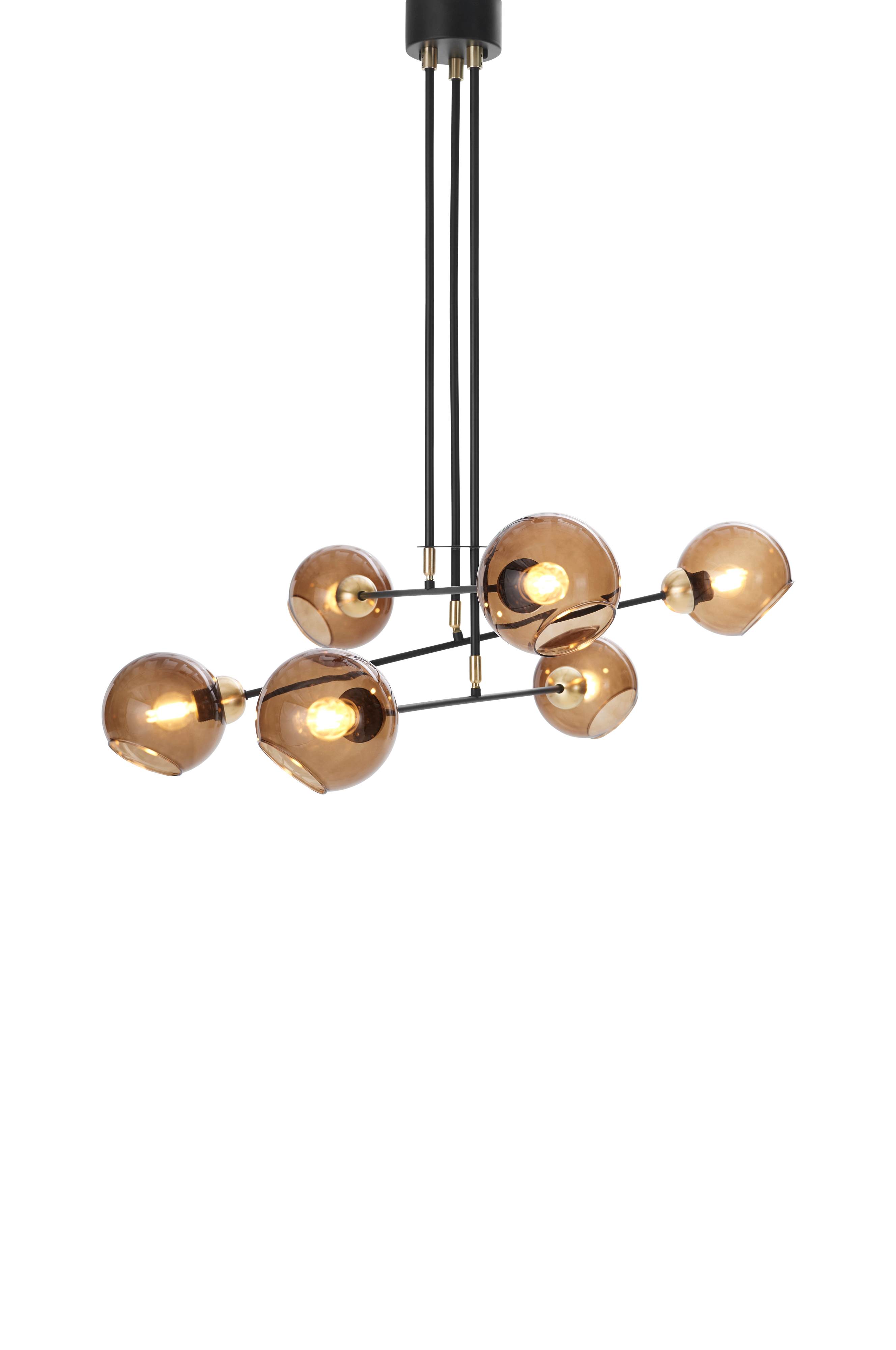 Loftlampe af metal i mat, sort finish. Baldakin med 3 metalstænger som er fastgjort i 3 arme. Armene kan justeres til siden. Kan ikke justeres i højden. 6 skærme af glas. Samlet højde ca. 100 cm. Armenes længde inkl. kupler 90 cm. Glasskærm diameter 15 cm. Baldakin af metal med bøjle. Sokkel 6 x E27, maks. 60 W. Pærer medfølger ikke. Jordet.