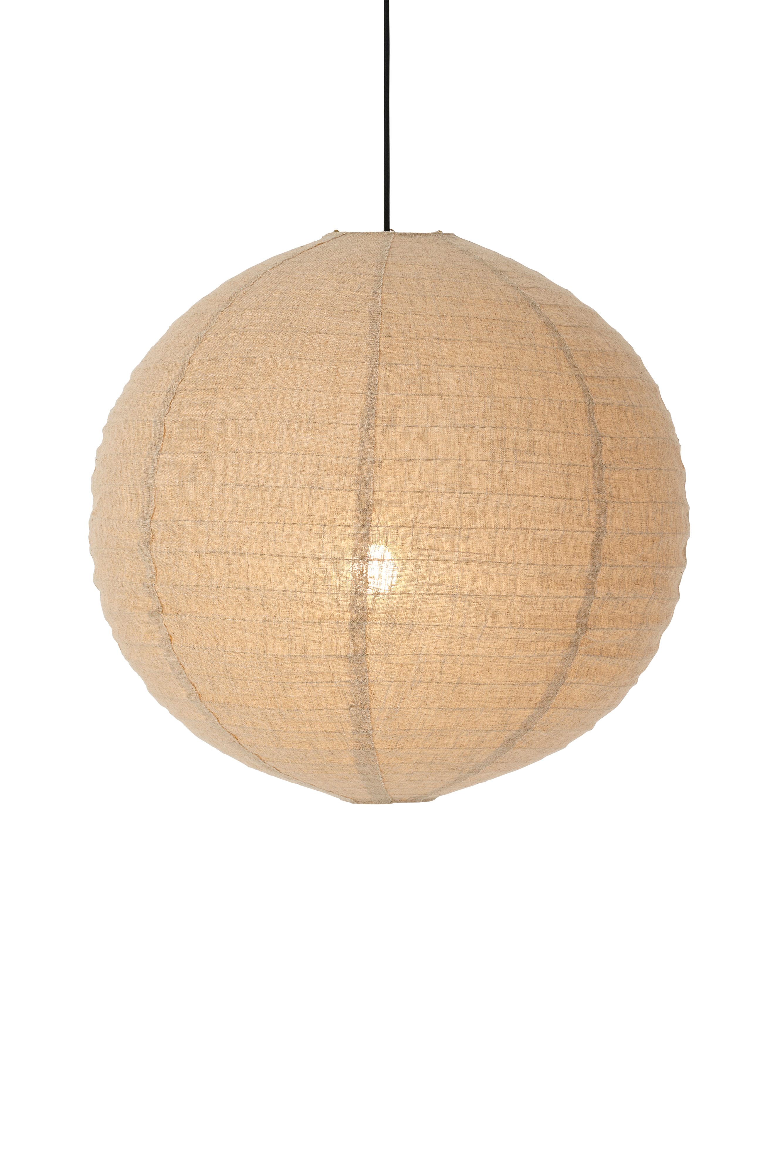 Loftskærm med strukturtekstil og riskonstruktion som giver et smukt lys. Skærmen har et indvendigt metalstel. Form metalrammen, når du monterer skærmen, så den får en rund form.