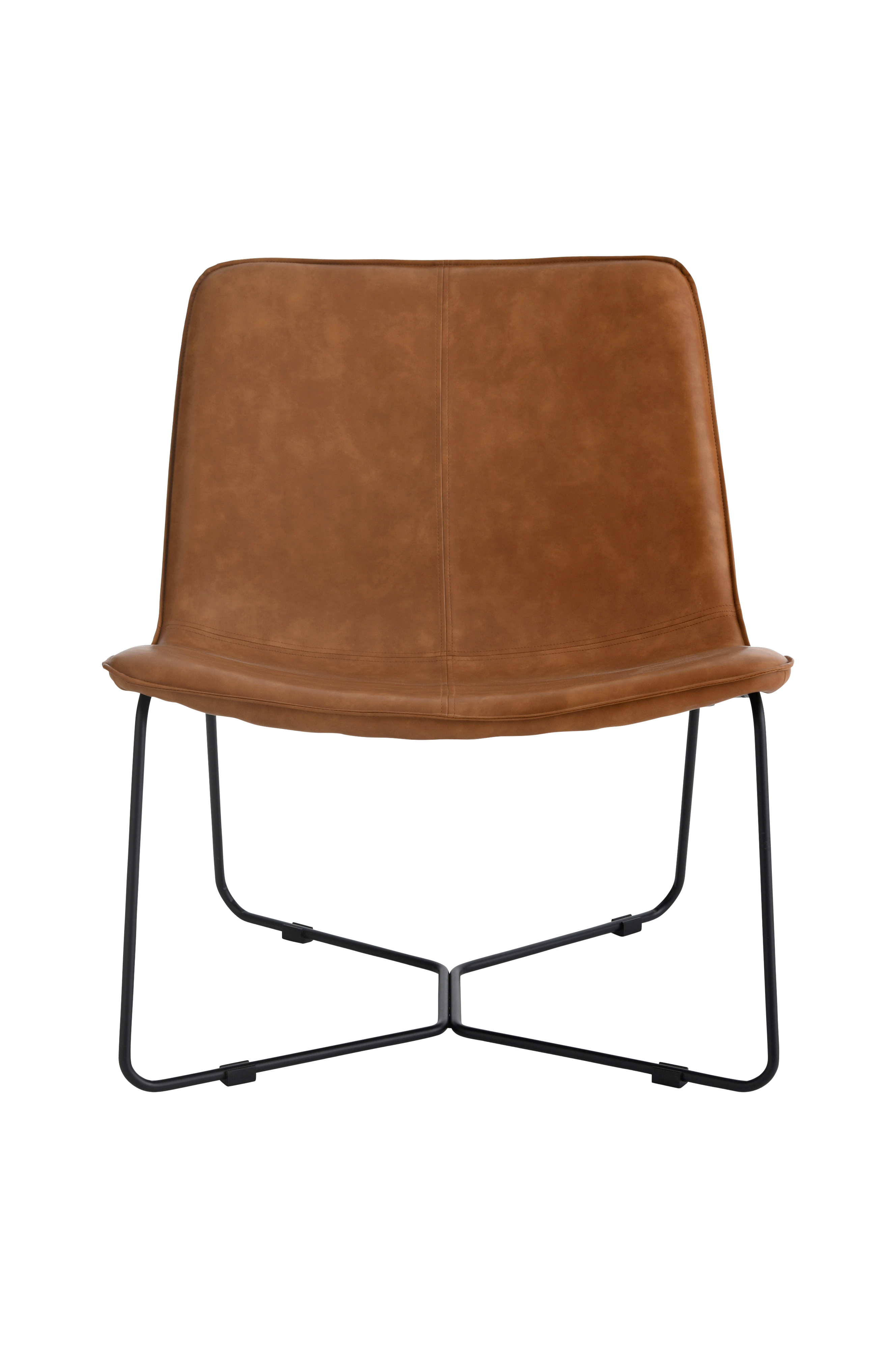 Loungestol i PU-læder (imiteret skind) med et levende tone-i-tone-mønster og jeanssøm midt foran på sæde og ryg. Ben af pulverlakeret metal. Skumfyld.