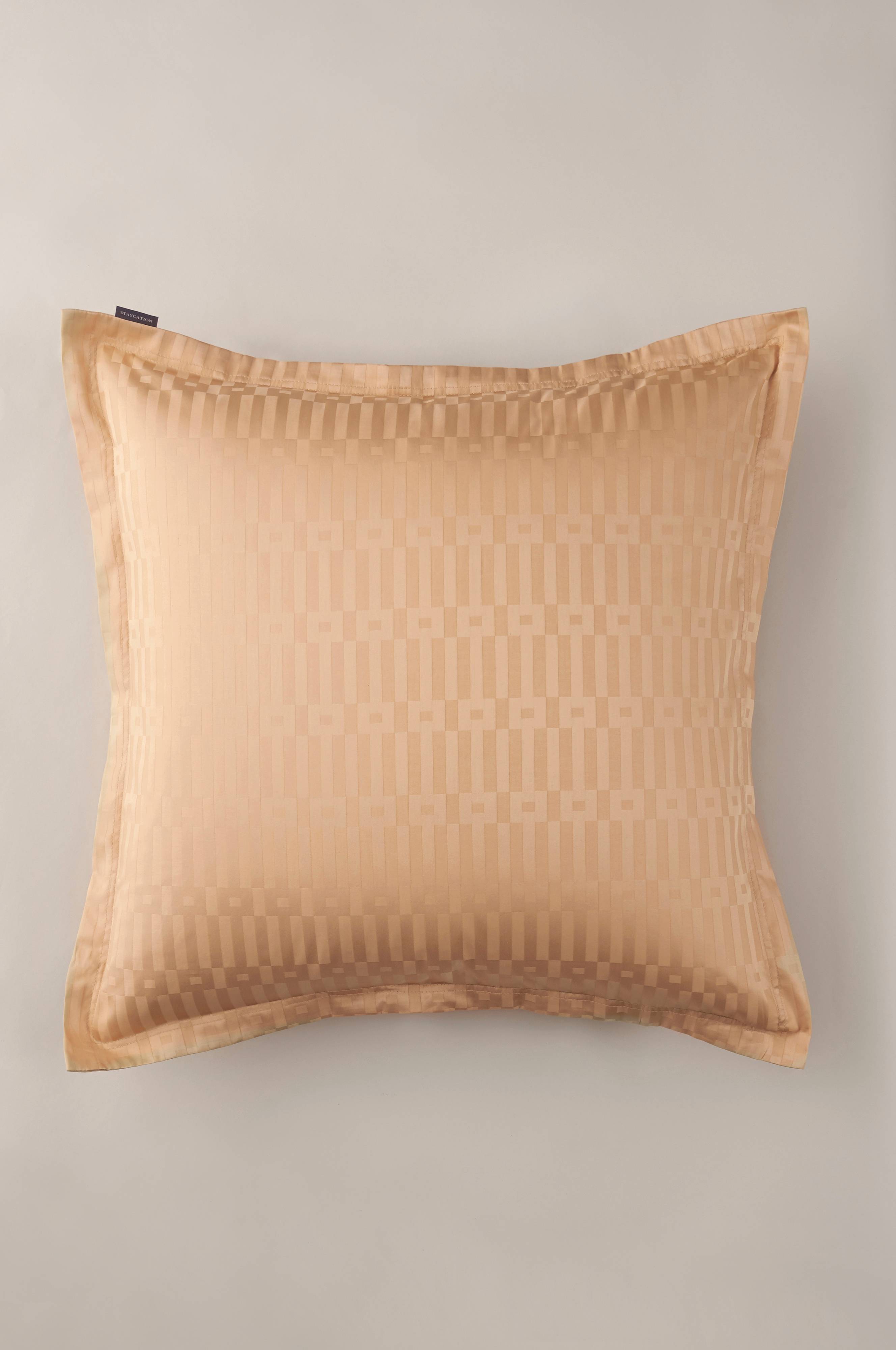 Jacquardvævet pudebetræk i satin af økologisk bomuld. Trådtæthed 300 TC. 3 cm vinge og dobbelte jeanssøm rundt om. Str. 65x65 cm. Leveres i en stofpose i samme kvalitet. Posen kan genbruges.