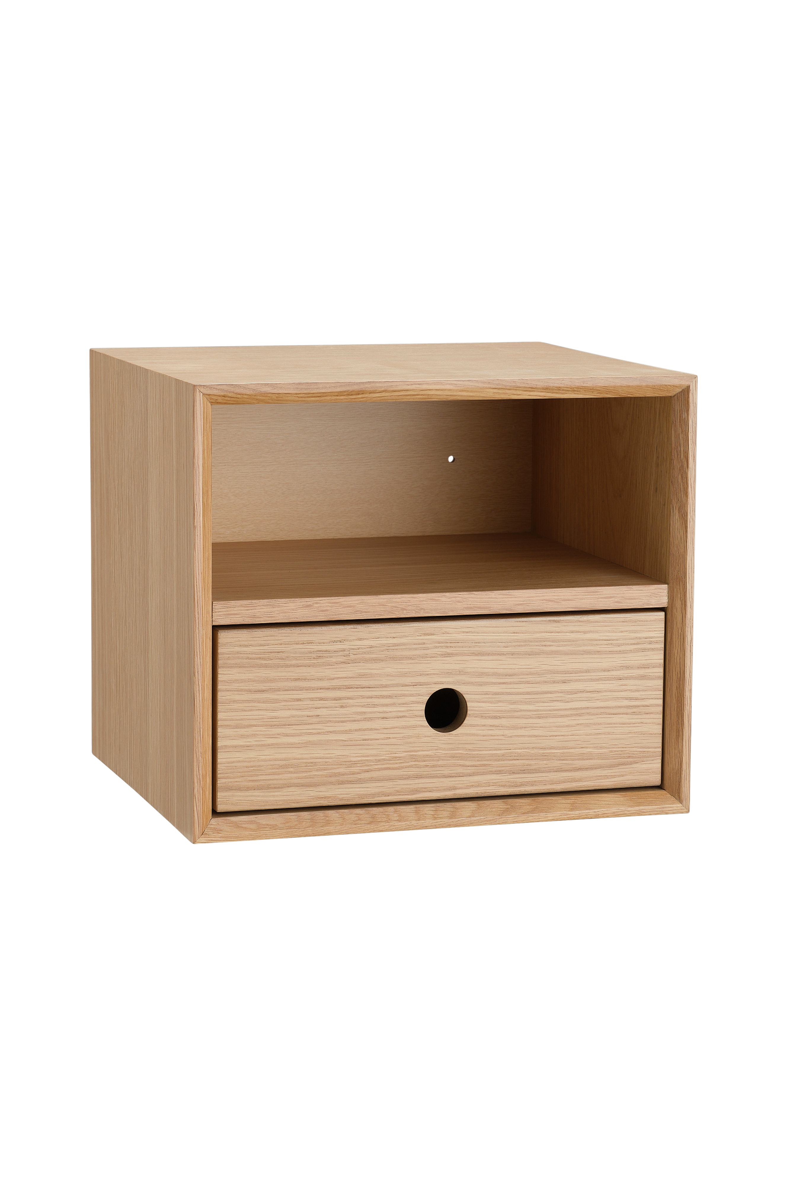 Sengebord til vægophængning, fremstillet af MDF. En fast hyldeflade og en skuffe med stopper. Kassens mål: B27xH13xD22 cm. Hyldens højde 13 cm.
