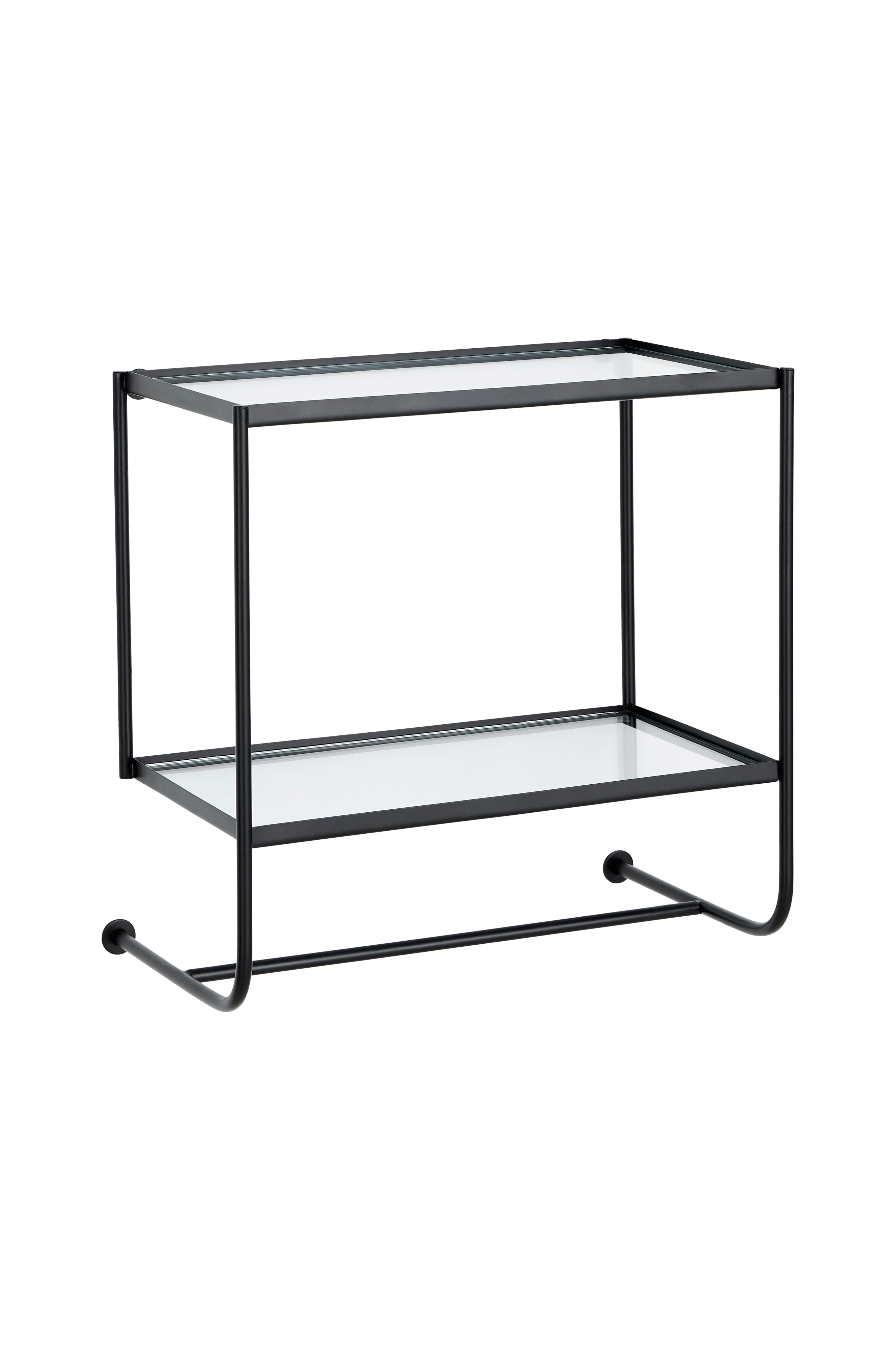 Sengebord i metal og glas. Hænges på væggen. Samlet. Bredde 53 cm, dybde 30 cm, højde 51,5 cm, højde mellem hylderne 31,5 cm.
