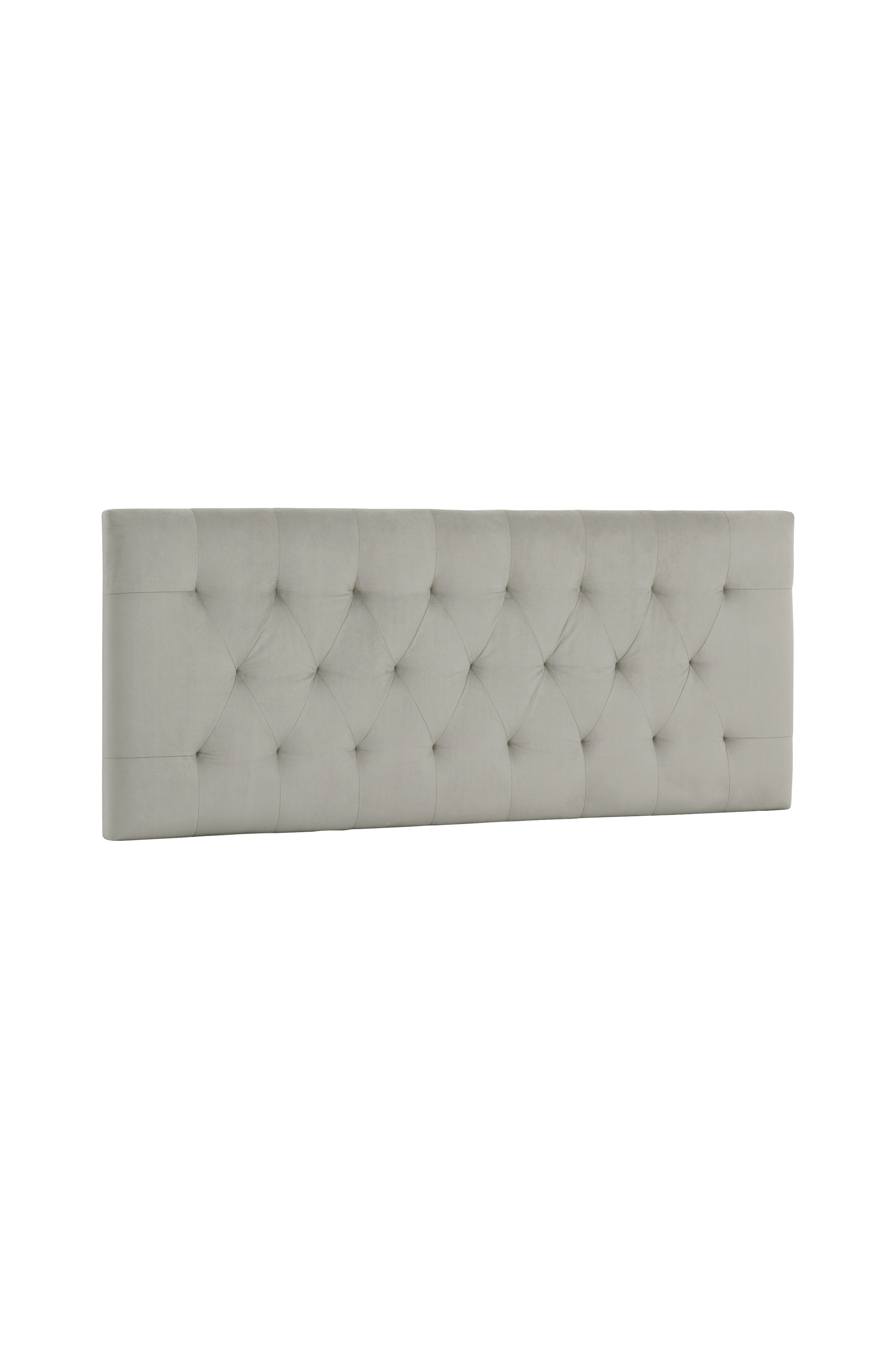 Polstret sengegavl som fastgøres på væggen (to kroge på bagsiden). Stel af træ. Betræk i velour af polyester og fyld af polyeter.