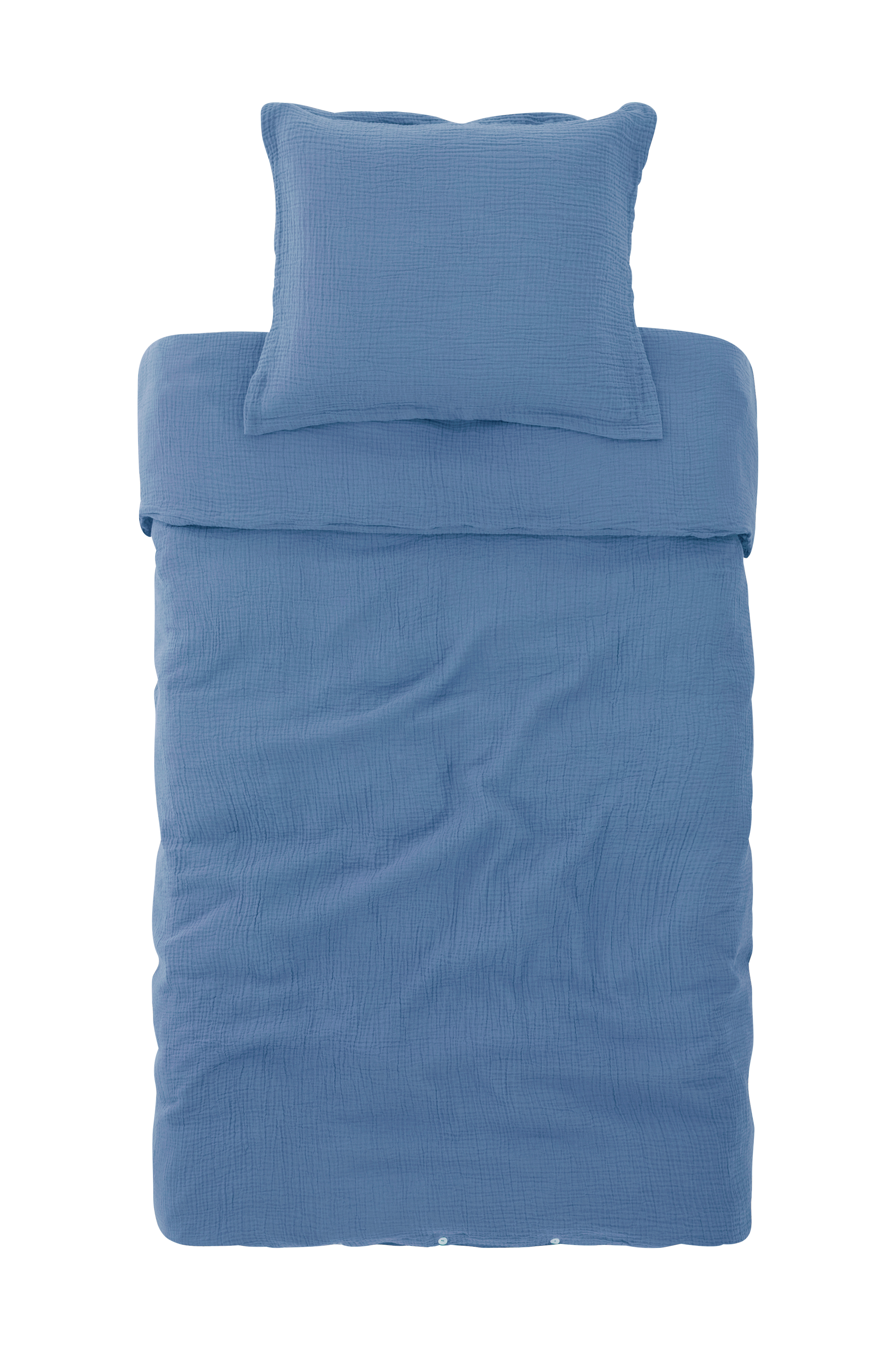 Sengesæt i 2 eller 3 dele. Af vasket, økologisk bomuldsmuslin i 2 lag. Dynebetrækket har knapper i kanten forneden. Pudebetrækket har 2,5 cm vinge rundt om. Trådtal: 230 TC. Muslin er et superblødt, luftigt og let struktureret stof med den velkendte rynkede effekt.