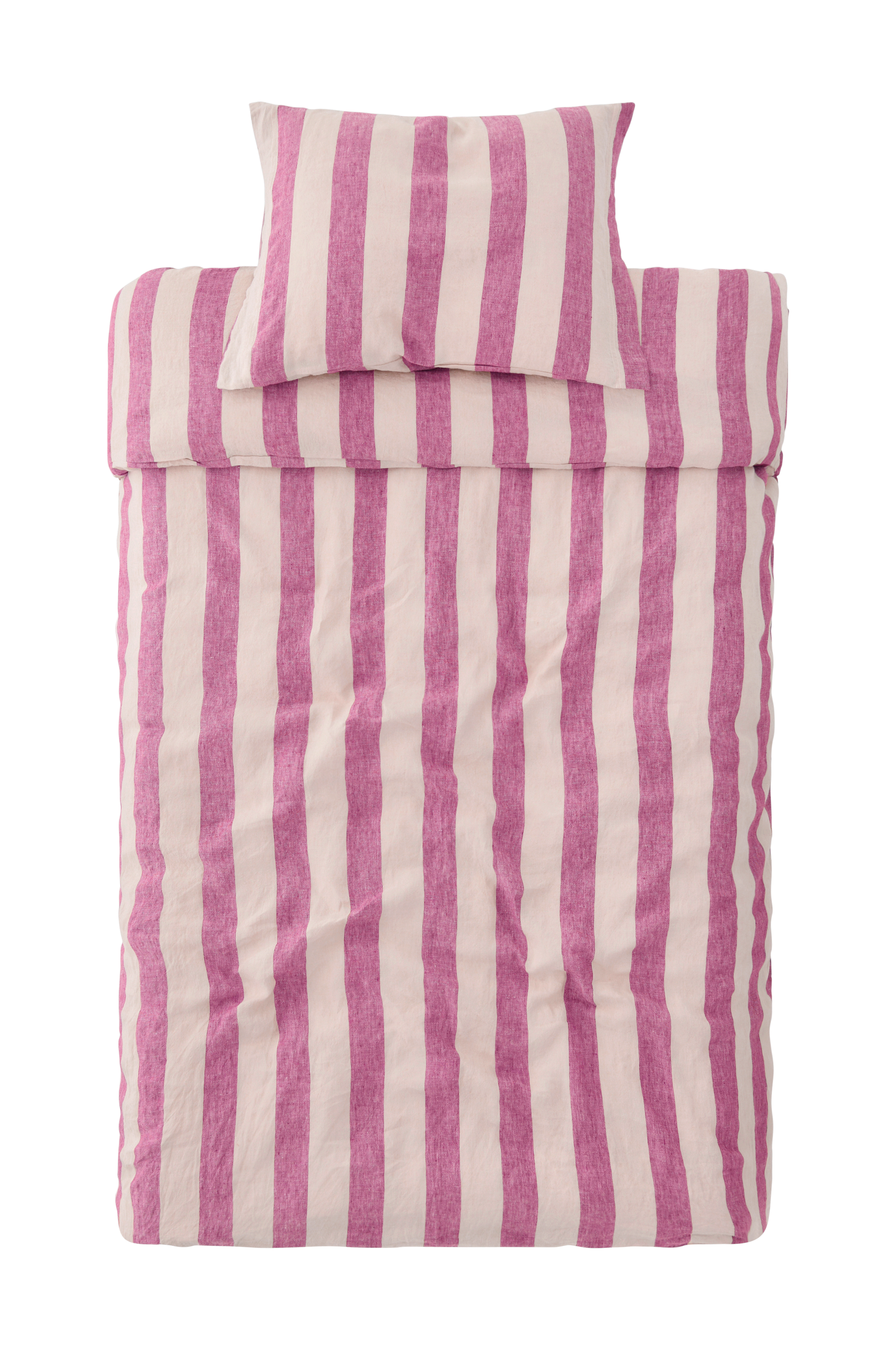 Sengesæt i vasket hørkvalitet af fransk hør med garnfarvede striber. Dynebetrækket har trykknapper i kanten forneden. Ingen huller til sengetøjsskift. Pudebetræk med 5 cm vinge på kortsiderne. Sættet indeholder 1 dynebetræk 150x200 cm (til enkeltdyne) og 1 pudebetræk 50x60 cm+vinge.