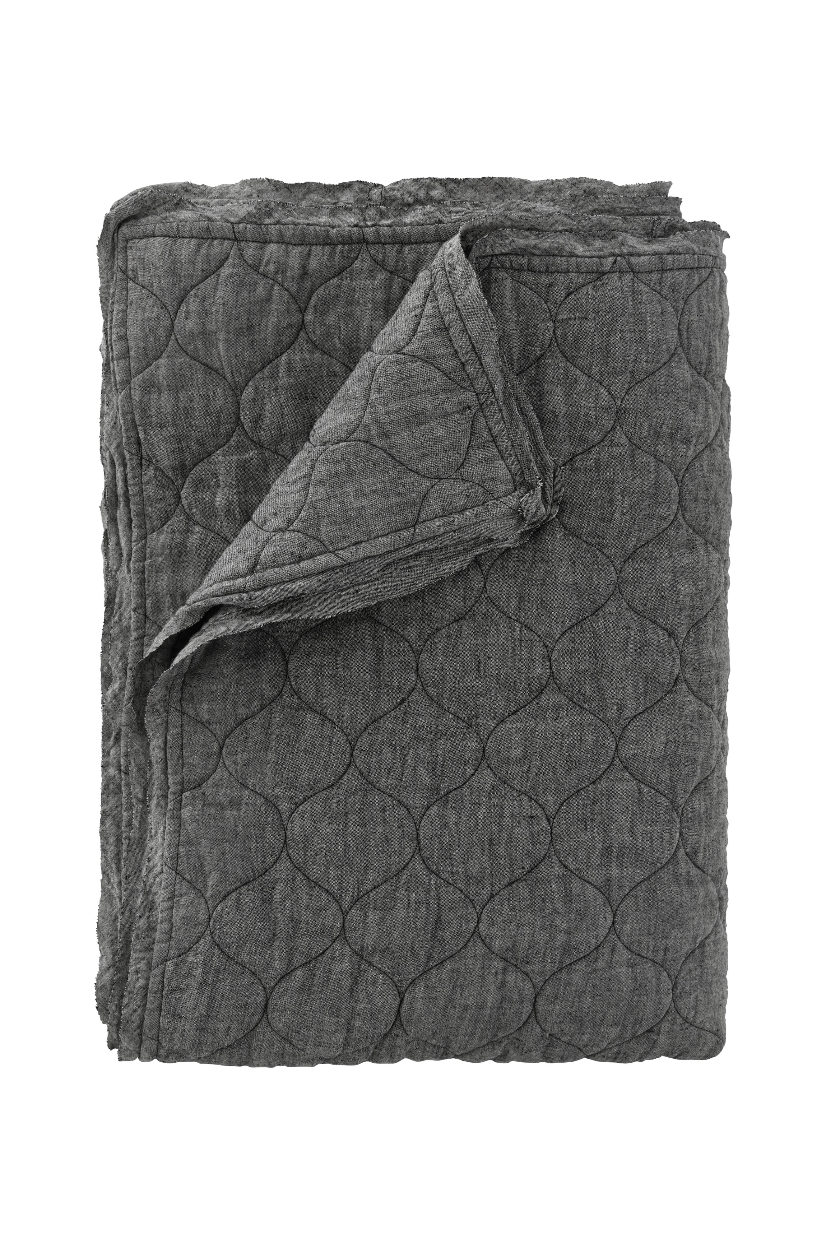 Sengetæppe i vasket og garnfarvet chambray af hør. Quiltet mønster og rå kant. Ensfarvet bagside af 100% bomuld. Str. 260x260 cm (passer til seng 160x200 cm og 180x200 cm)