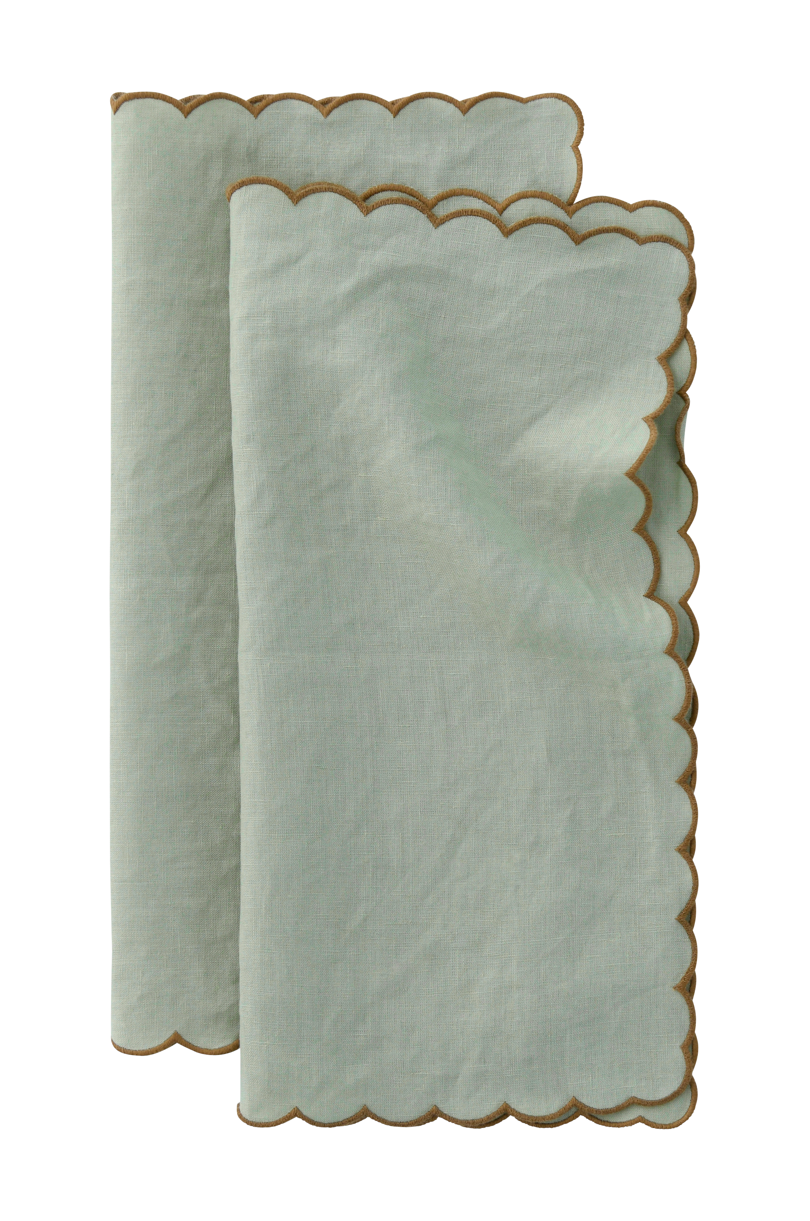 2 servietter i vasket hør med smuk struktur. Bølgekant med overlocksøm i kontrastfarve hele vejen rundt.