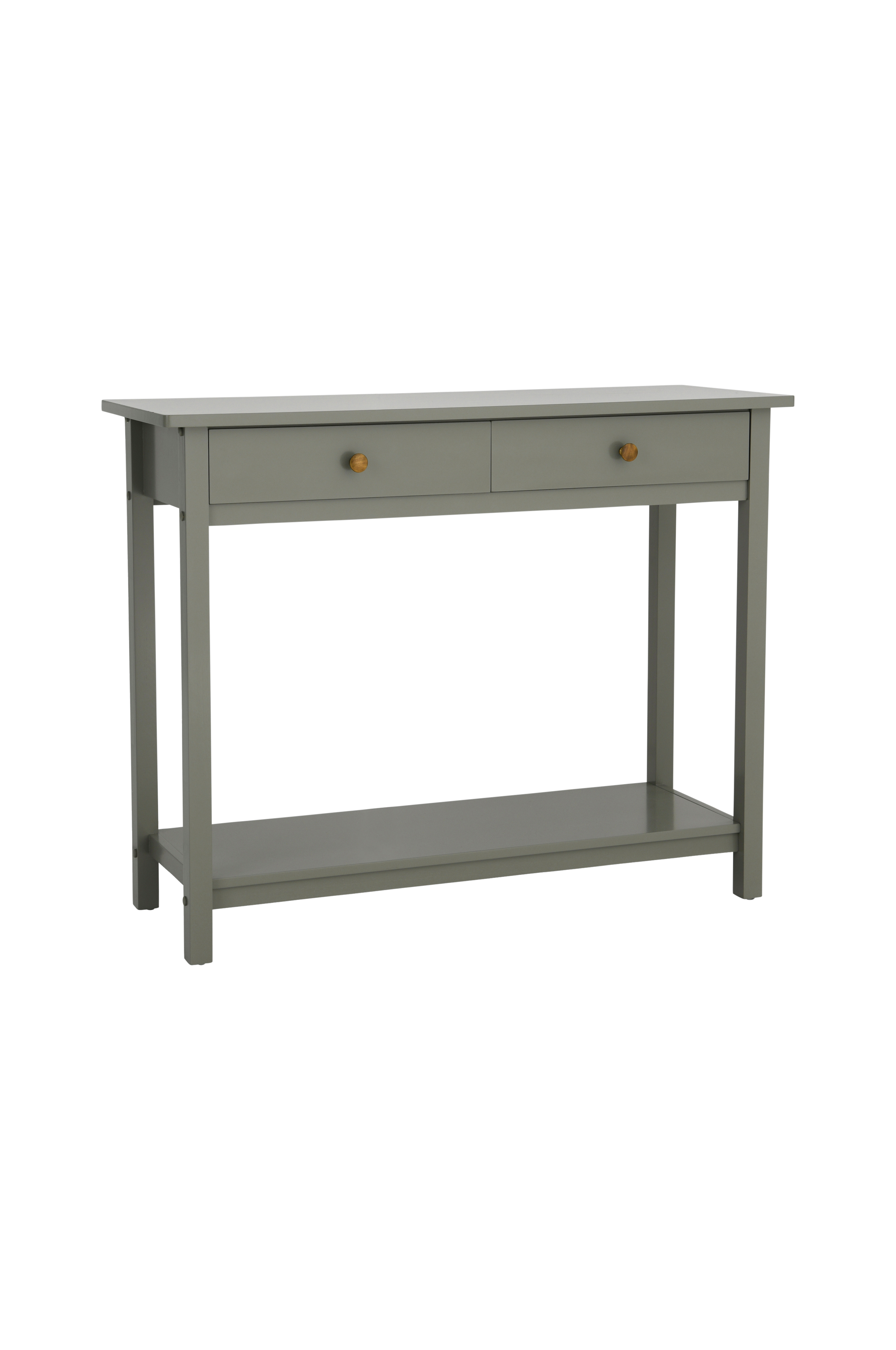 Skænk i massiv fyr og MDF. To små skuffer. Højde 82,5 cm, bredde 104 cm, dybde 37 cm. Højde fra gulv til hyldeflade 7 cm. Lev. usamlet.