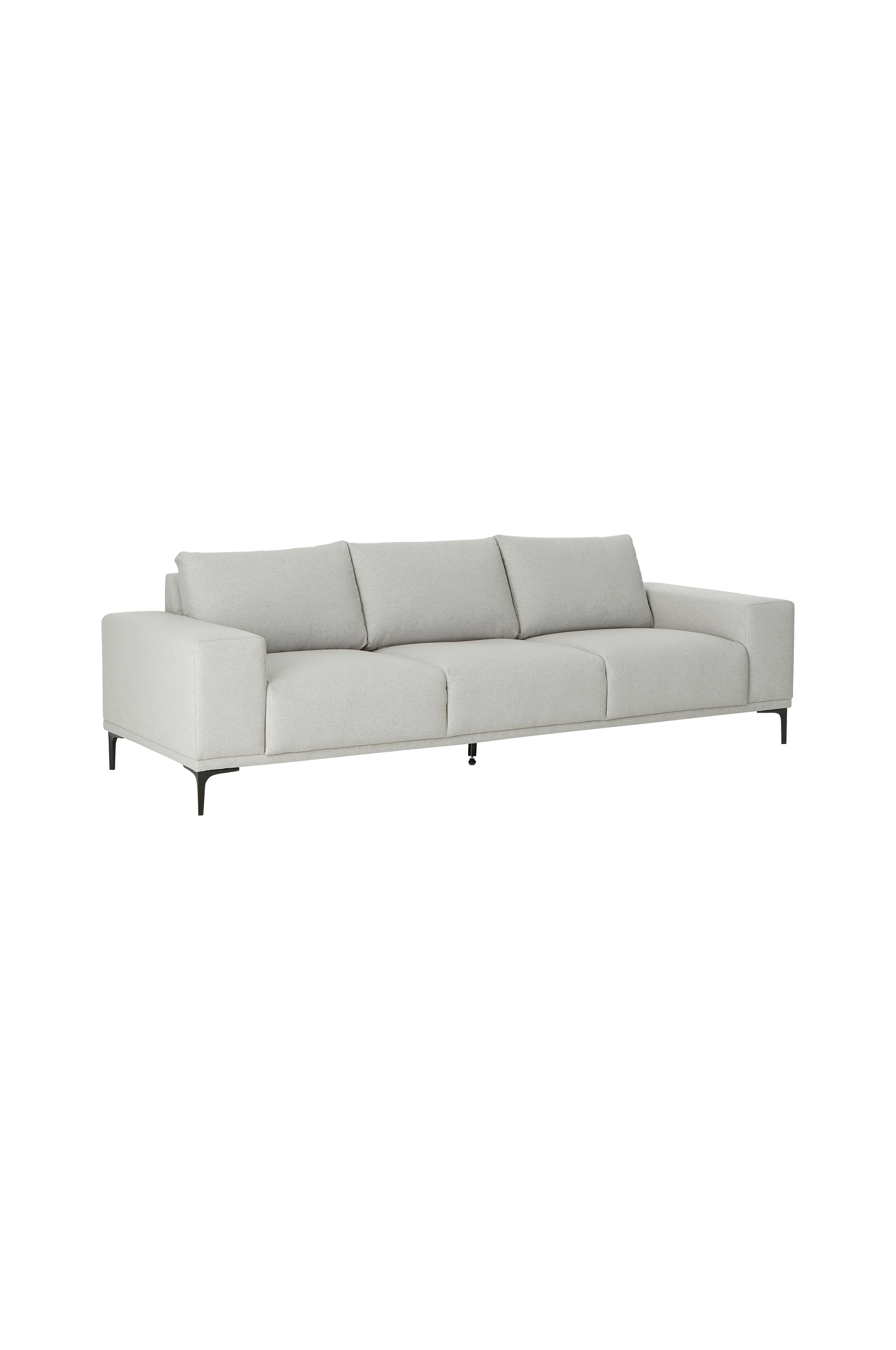Sofa Belina 3-pers. Betræk i to farver med forskellig struktur (lysegrå i chenille-look og mørkegrå i noget grovere kvalitet). >25000 Martindale. Ryghyndernes betræk er aftageligt, fast betræk på øvrige dele. Ramme i plywood, ben i metal. Fyld af PU-skum. Mål: Højde 75 cm, bredde 245 cm, dybde 91 cm, siddehøjde 44 cm, siddedybde 60 cm, siddebredde 192 cm. Benhøjde 15 cm.