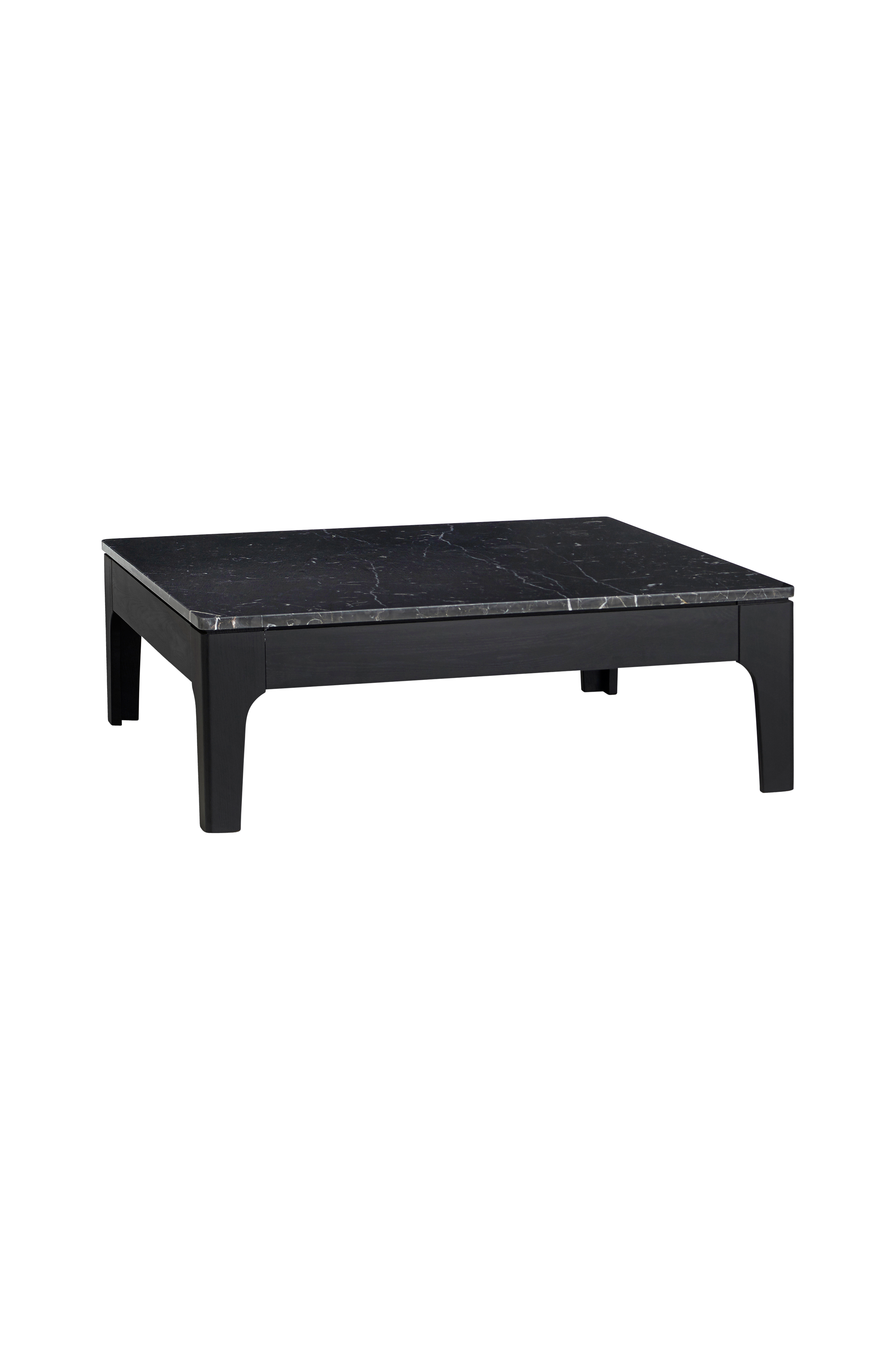 Lavt, moderne sofabord med bordplade i marmor. Stel og ben i massiv bøg. Højde 34 cm, bredde 100 cm, længde 100 cm. Benhøjde 23 cm. Maks. belastning 50 kg. Nem at samle (benene skrues på ved levering).