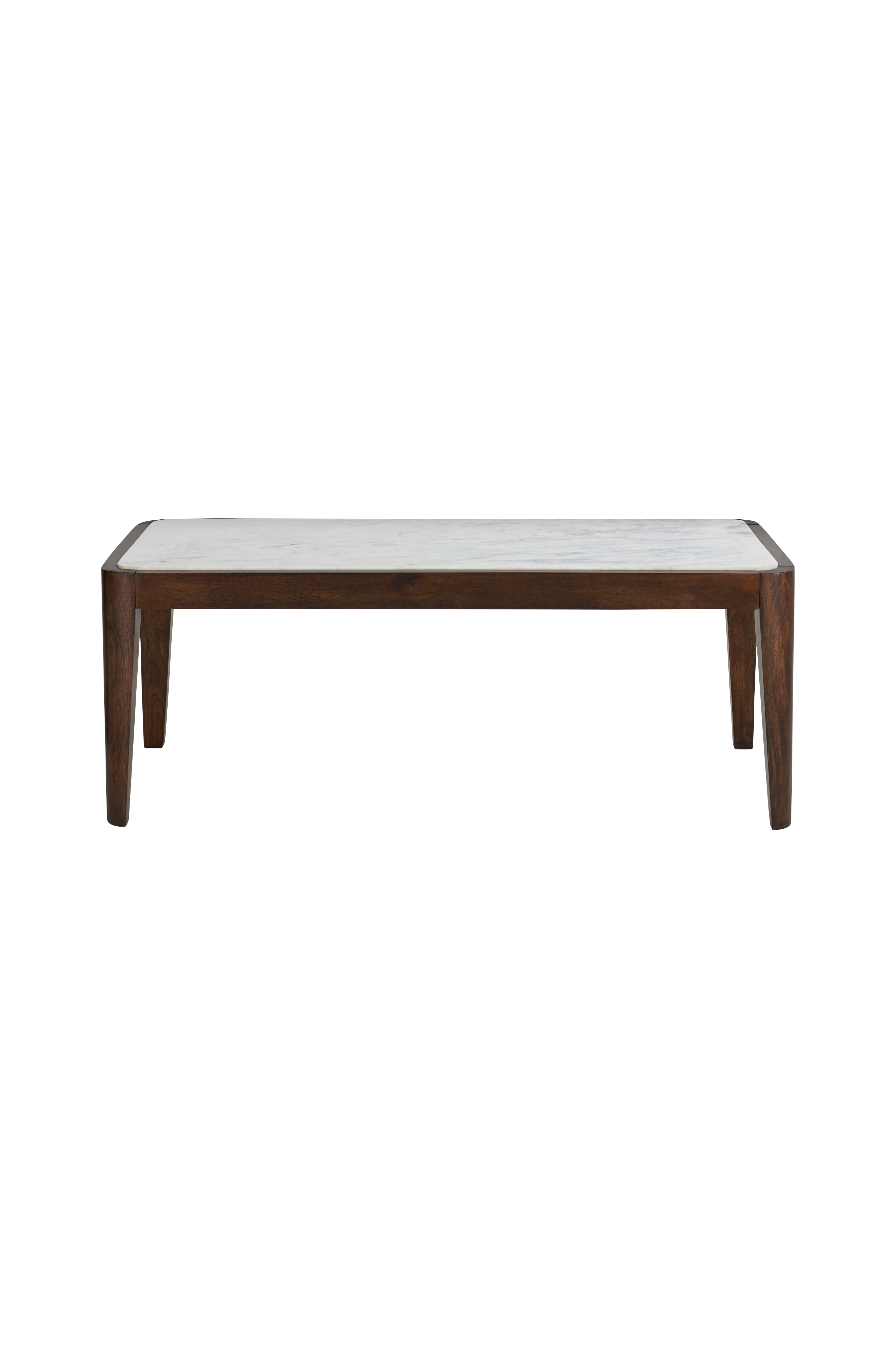Sofabord i mangotræ med bordplade af marmor. Med en MDF-plade som støtte under marmorpladen. Mål: 56x115 cm. Højde 43 cm. Lettere montering.