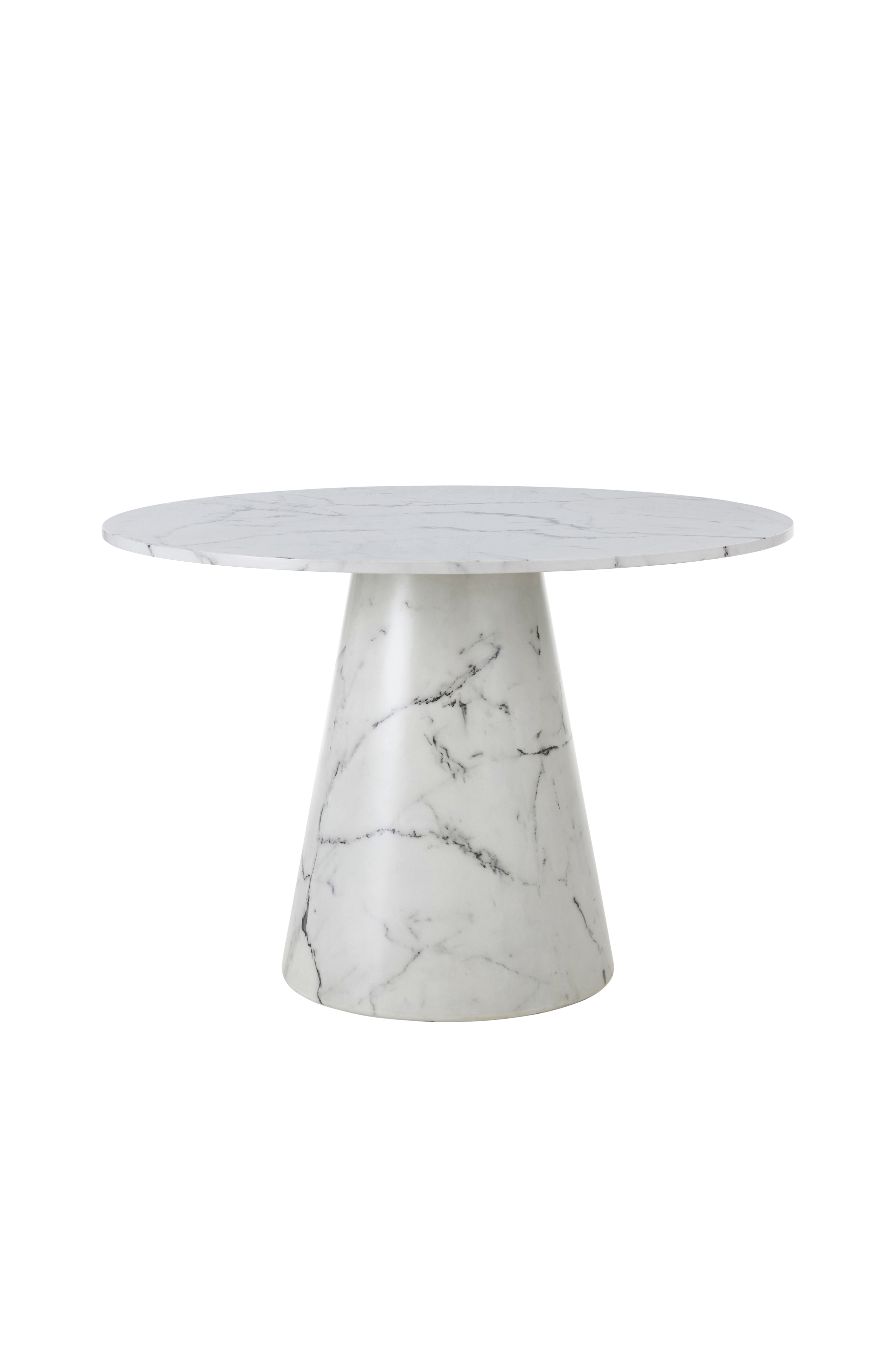 Spisebord af folieret MDF i naturtro marmorlook med en robust, vandafvisende overflade. Mål: Diameter 110 cm, højde 76 cm. Diameter forneden 54 cm.