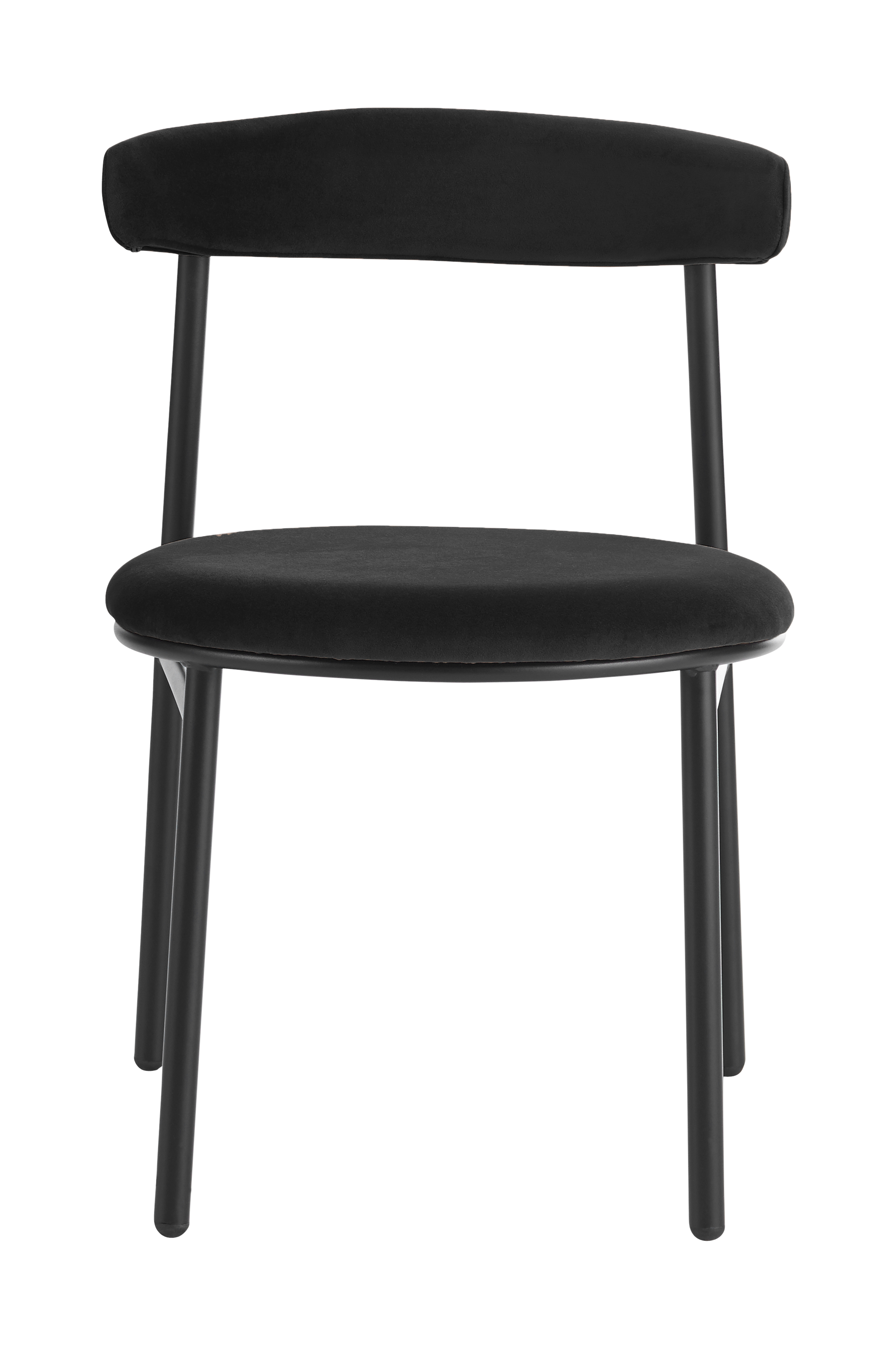 2 stole i moderne design med rundt sæde og svungen ryg. Stel og ben i metal. Sæde og ryg med skumpolstring. Lettere samling.