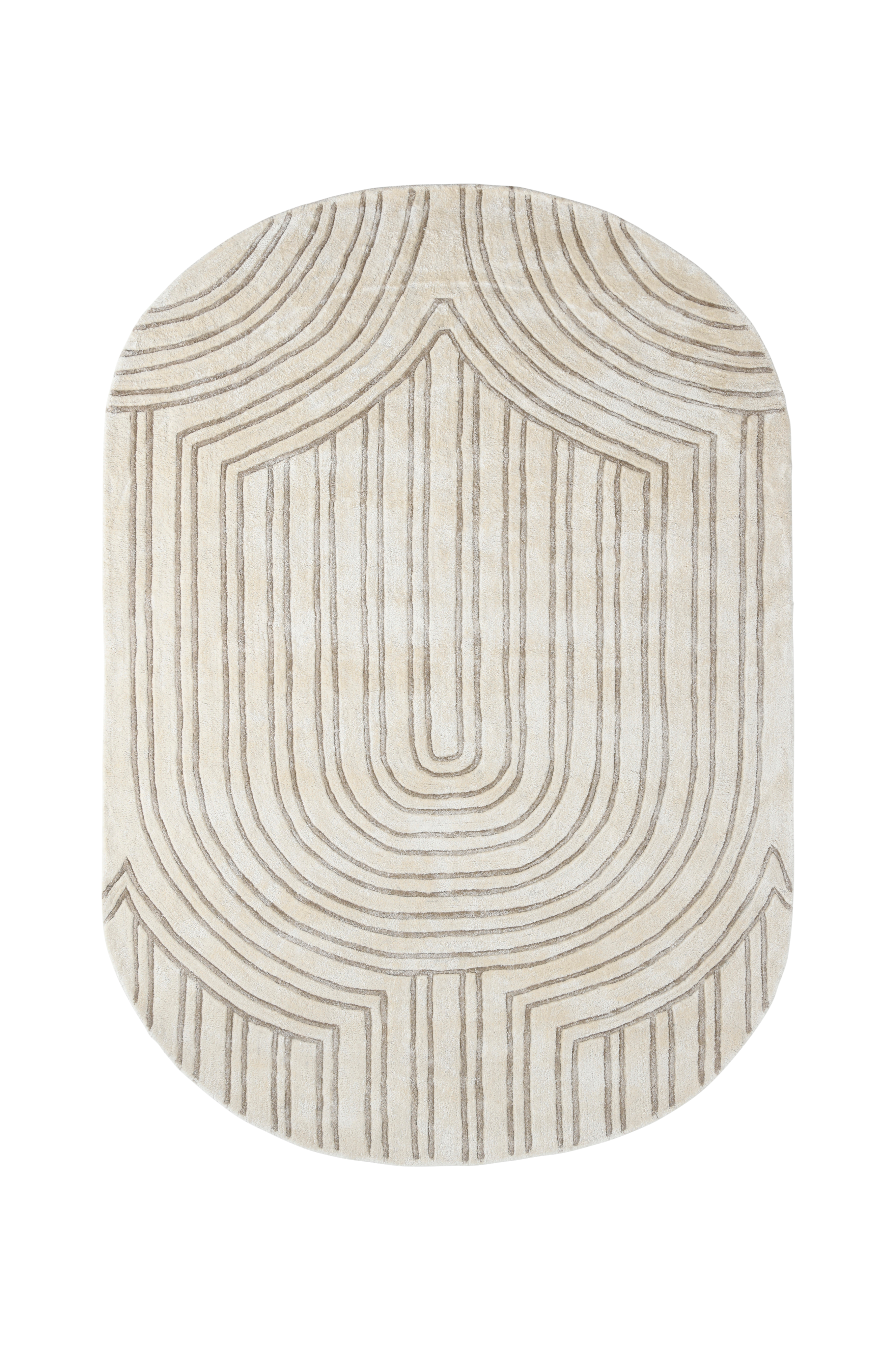 Håndknyttet tæppe i skinnende viskose. Mønster tone-i-tone med runde former.