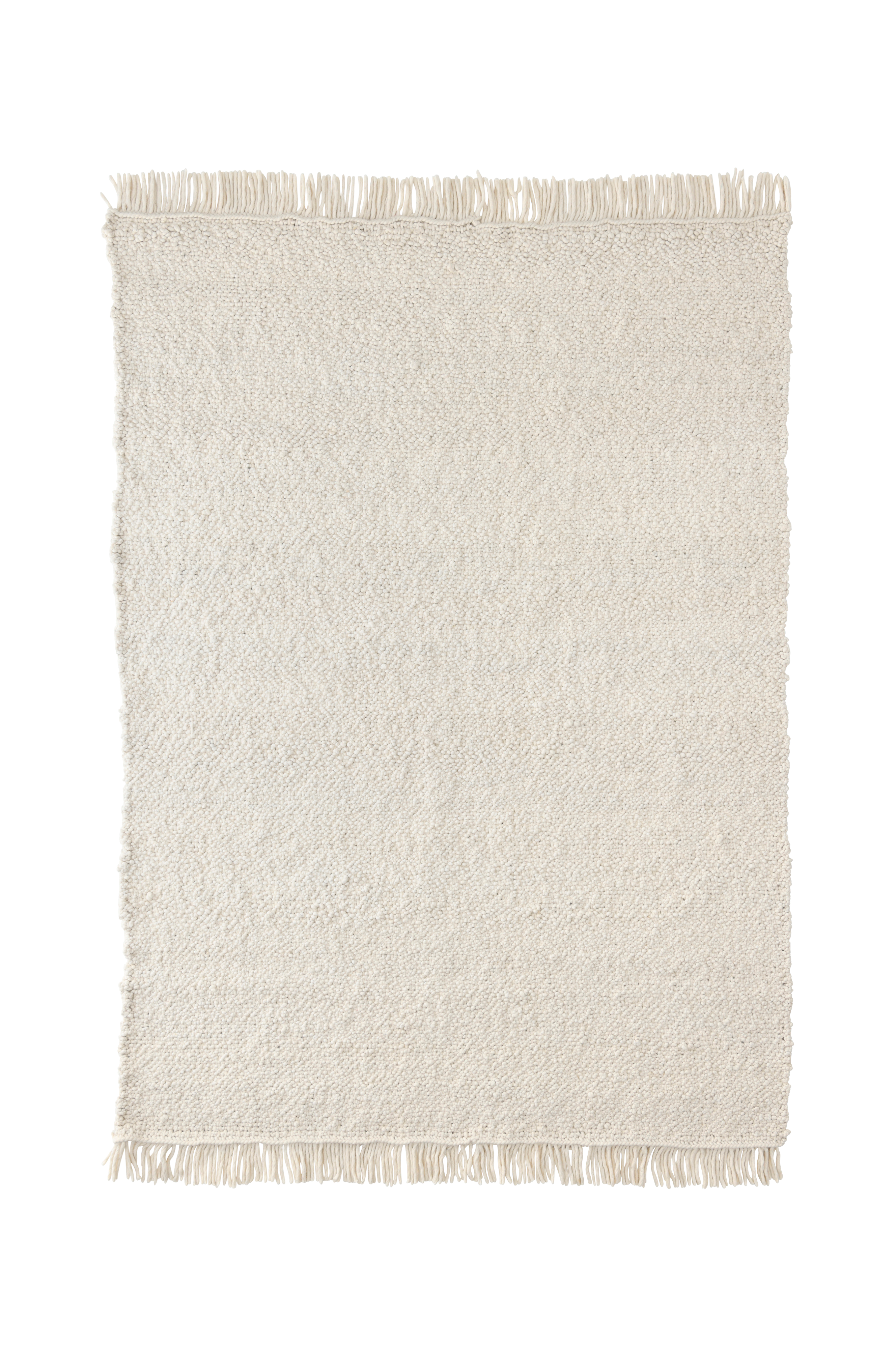 Vævet uldtæppe med strukturmønstret overflade og lange, kraftige frynser i enderne.