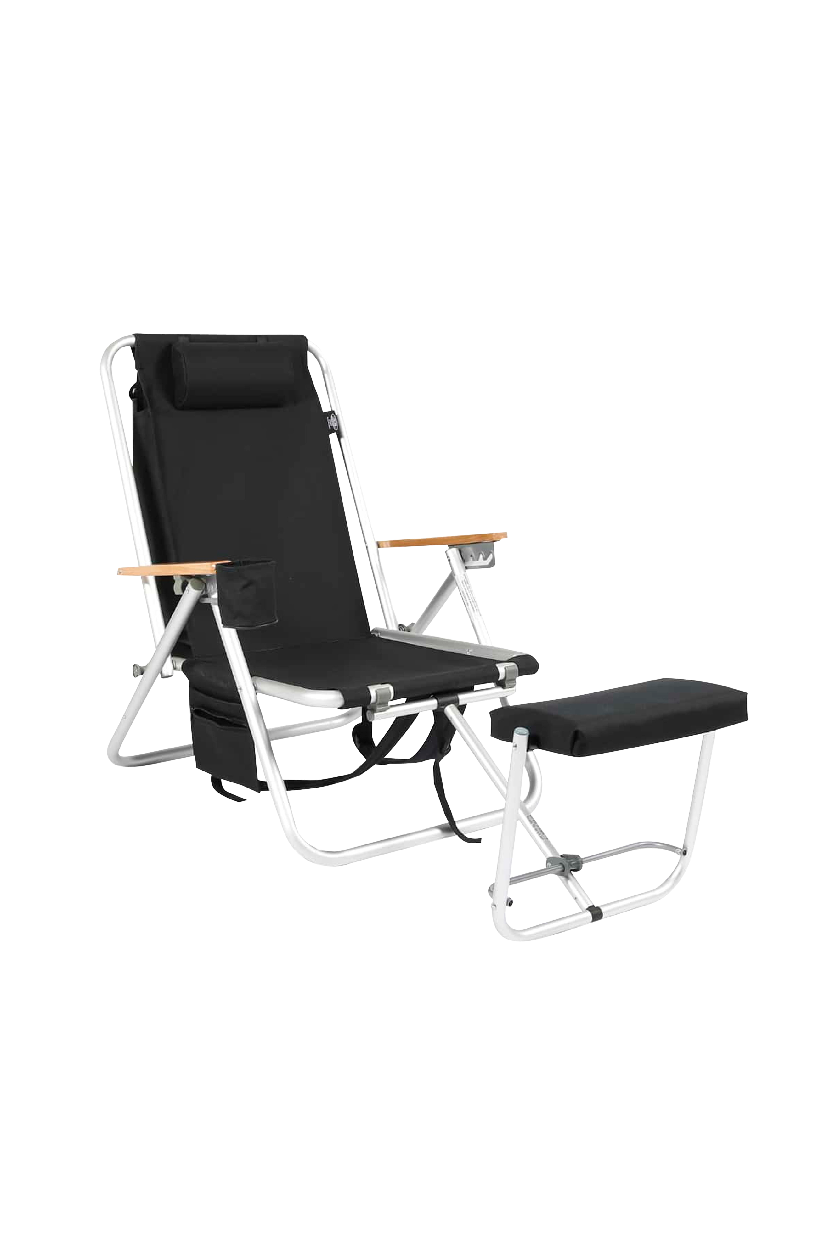 En udendørs stol med træhåndtag, justerbar ryg, rygsæk og fodskammel. Denne model er udvidet med en køletaske og mobillomme. Fodskamlen kan nemt vendes og bruges som et lille bord. Materiale: aluminium og polyester. Maksimal vægt: 110 kg
