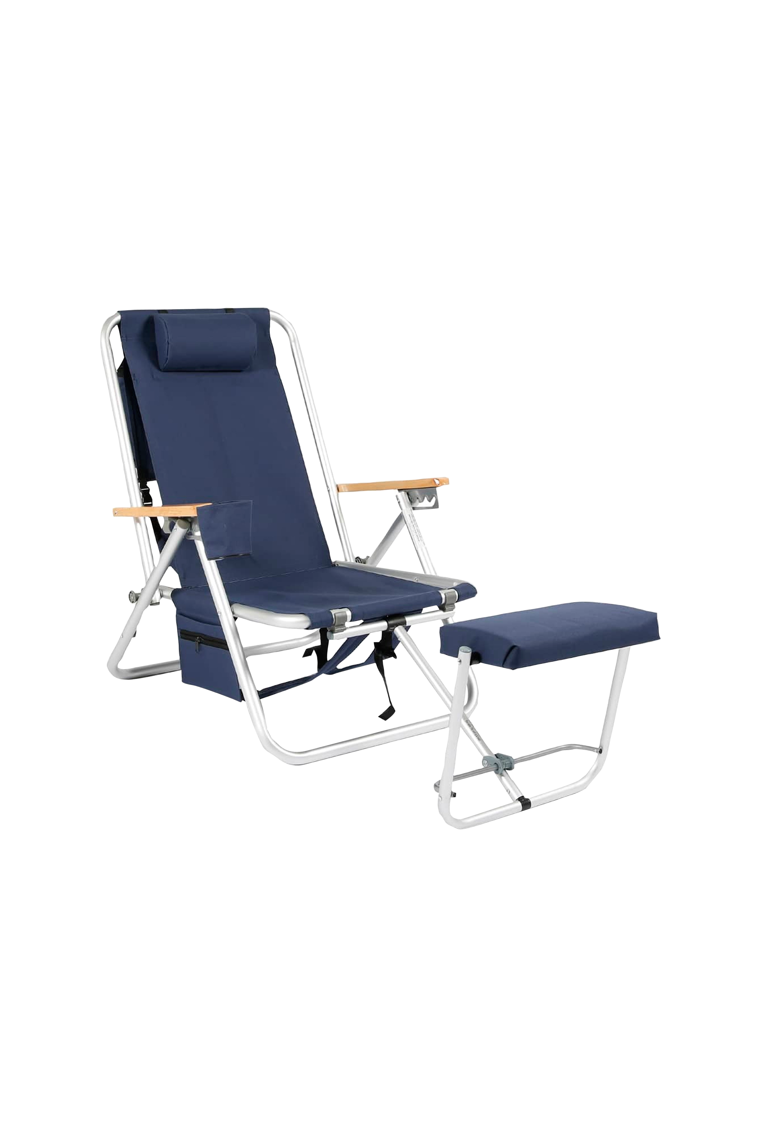 En udendørs stol med træhåndtag, justerbar ryg, rygsæk og fodskammel. Denne model er udvidet med en køletaske og mobillomme. Fodskamlen kan nemt vendes og bruges som et lille bord. Materiale: aluminium og polyester. Maksimal vægt: 110 kg
