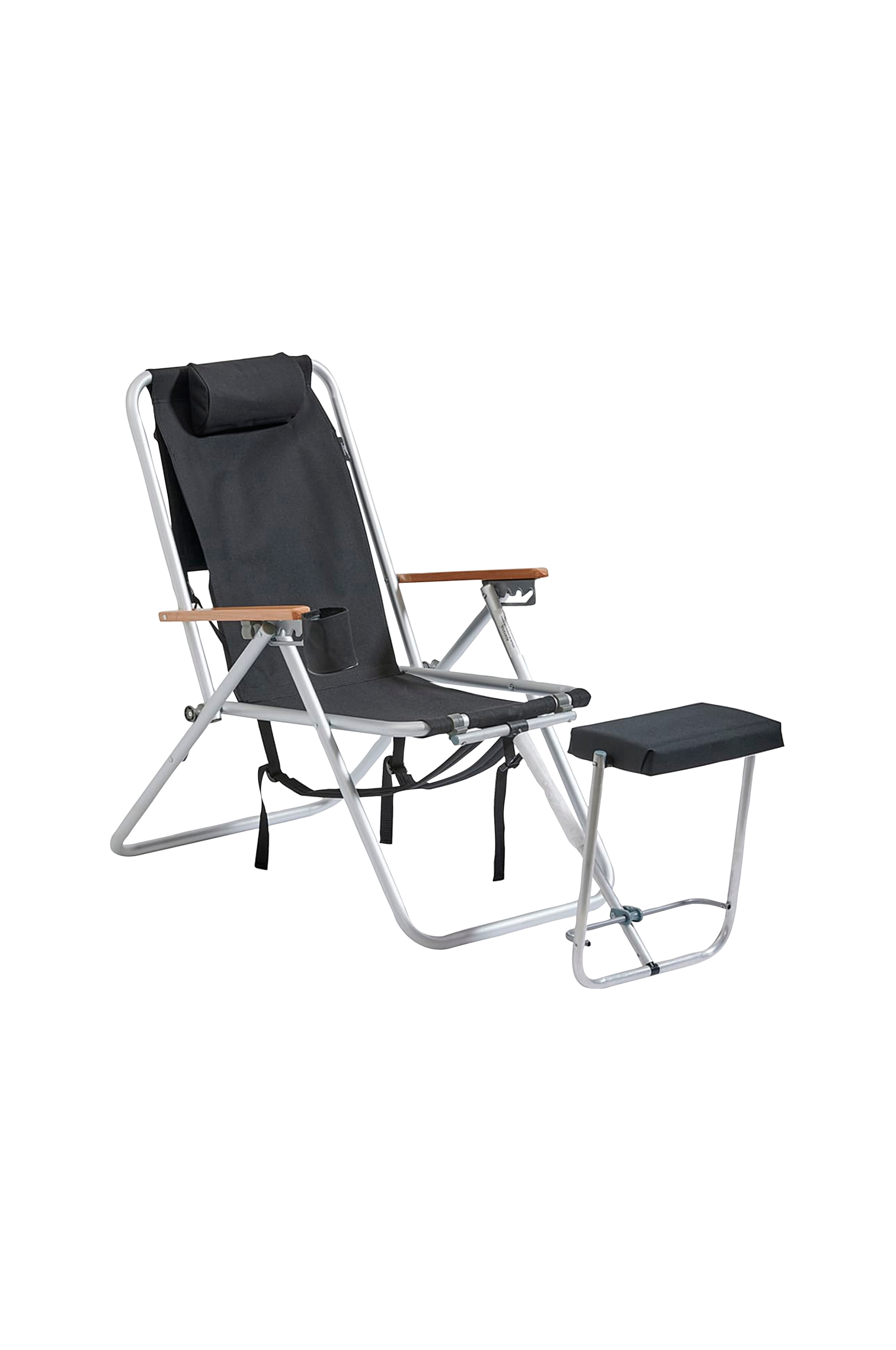 En udendørs stol med træhåndtag, justerbar ryg, rygsæk og fodskammel. Denne model er højere end jorden. Fodskamlen kan nemt vendes og bruges som et lille bord. Materiale: alumnium og polyester. Maksimal vægt: 135 kg