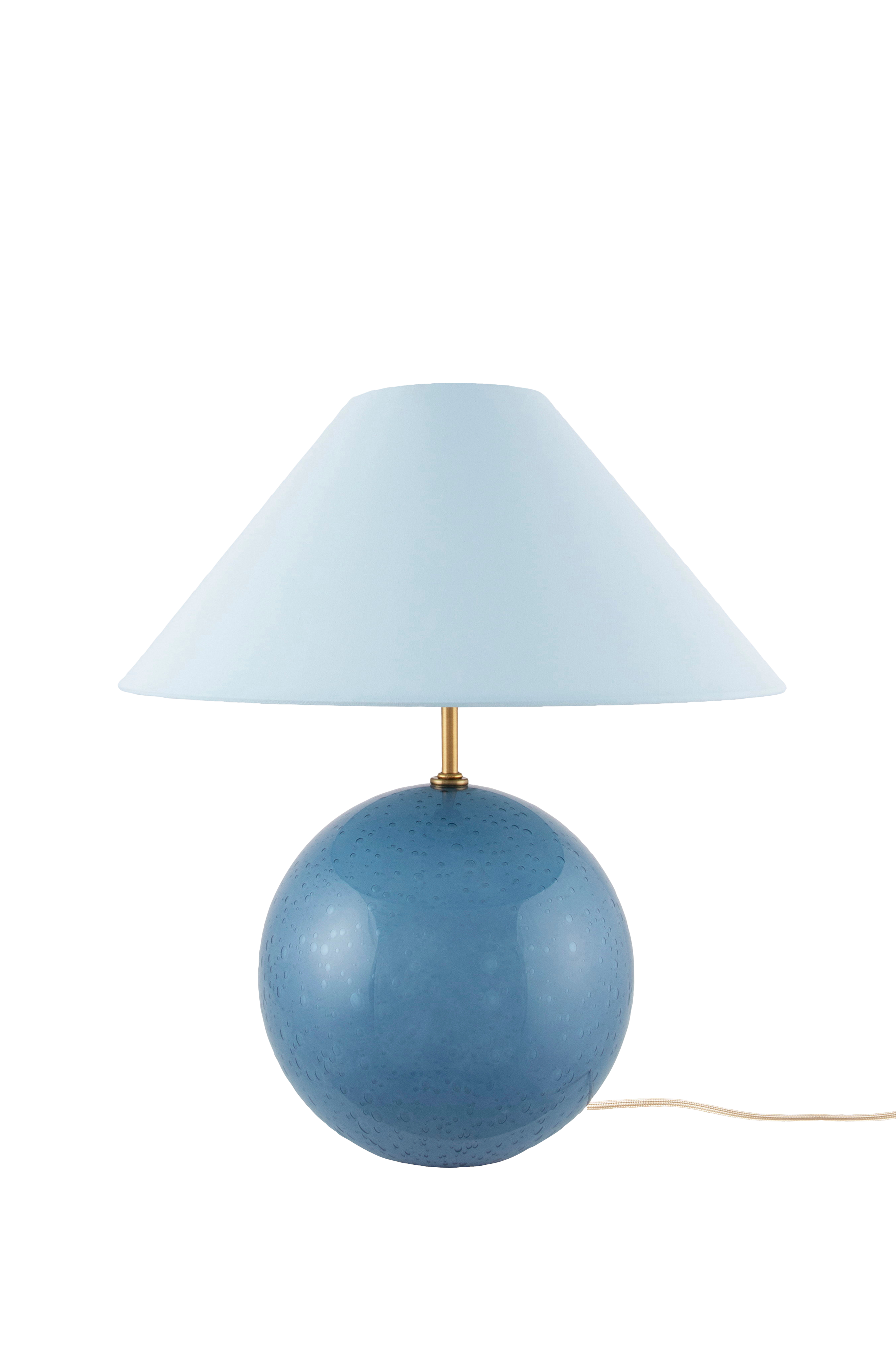 Iris er lavet af tonet glas med blæste luftbobler og har en matchende bomuldslampeskærm med en dækket top, der matcher lampefoden. Lampen er lidt større i størrelsen og er ideel til at placere på et sidebord, en større kommode eller i et dybere vindue. Iris har et 200 cm langt beige, perlemorsfarvet tekstilkabel med afbryder og stik. Bemærk, at luftboblerne i glasset varierer i størrelse og skaber et unikt mønster for hver lampe, så den lampe, du har, kan afvige en smule fra billederne. Lampen er kompatibel med lysdæmper. Lyskilde medfølger ikke.