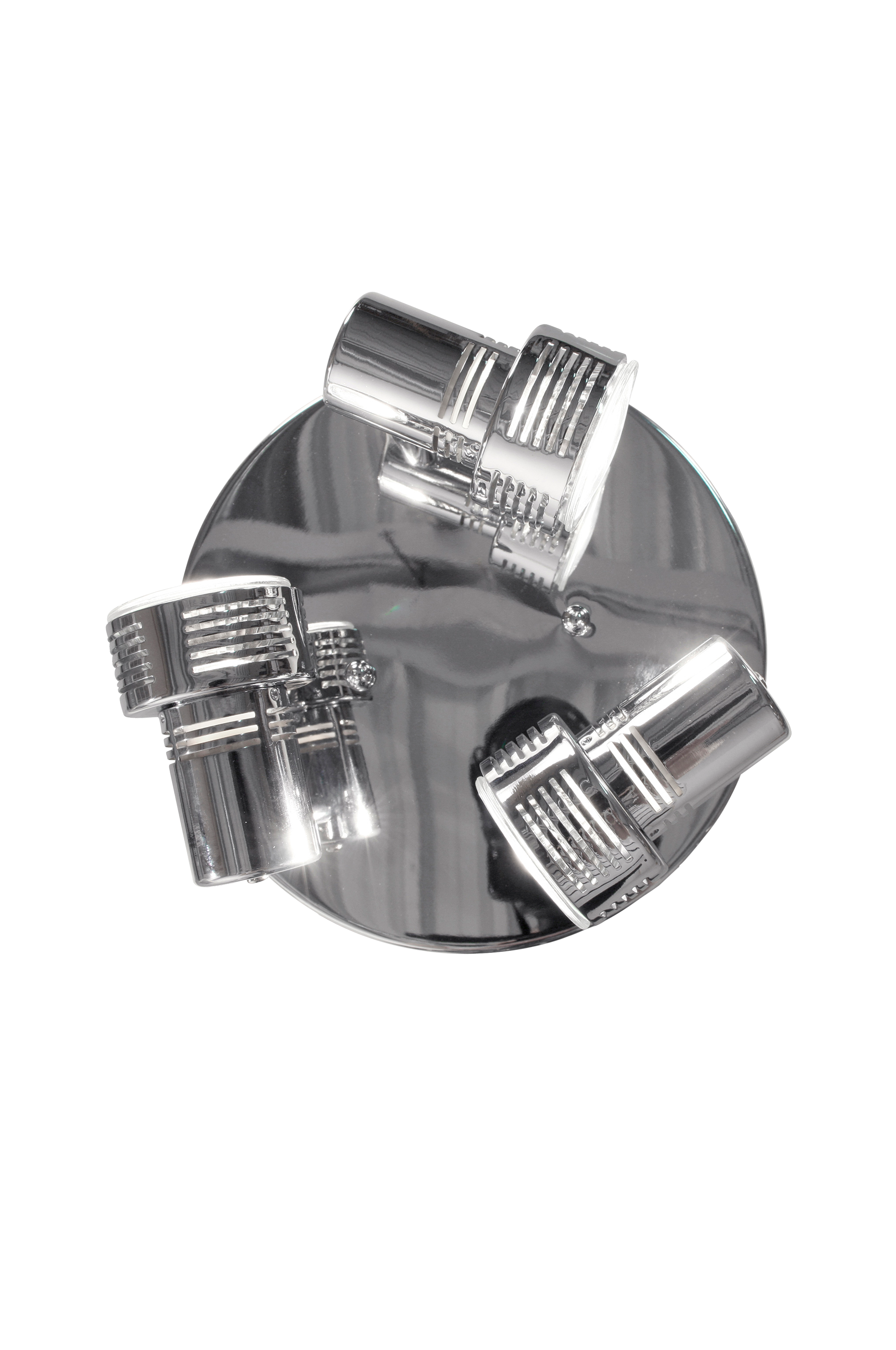 Plafond af forkromet metal. Dekorative riller på skærmen. Højde 16 cm og diameter 22 cm. Fatninger 3 x GU10. Maks. 35 W. Halogen inkluderet. Kompatibel med lysdæmper. Klasse II, jordet.