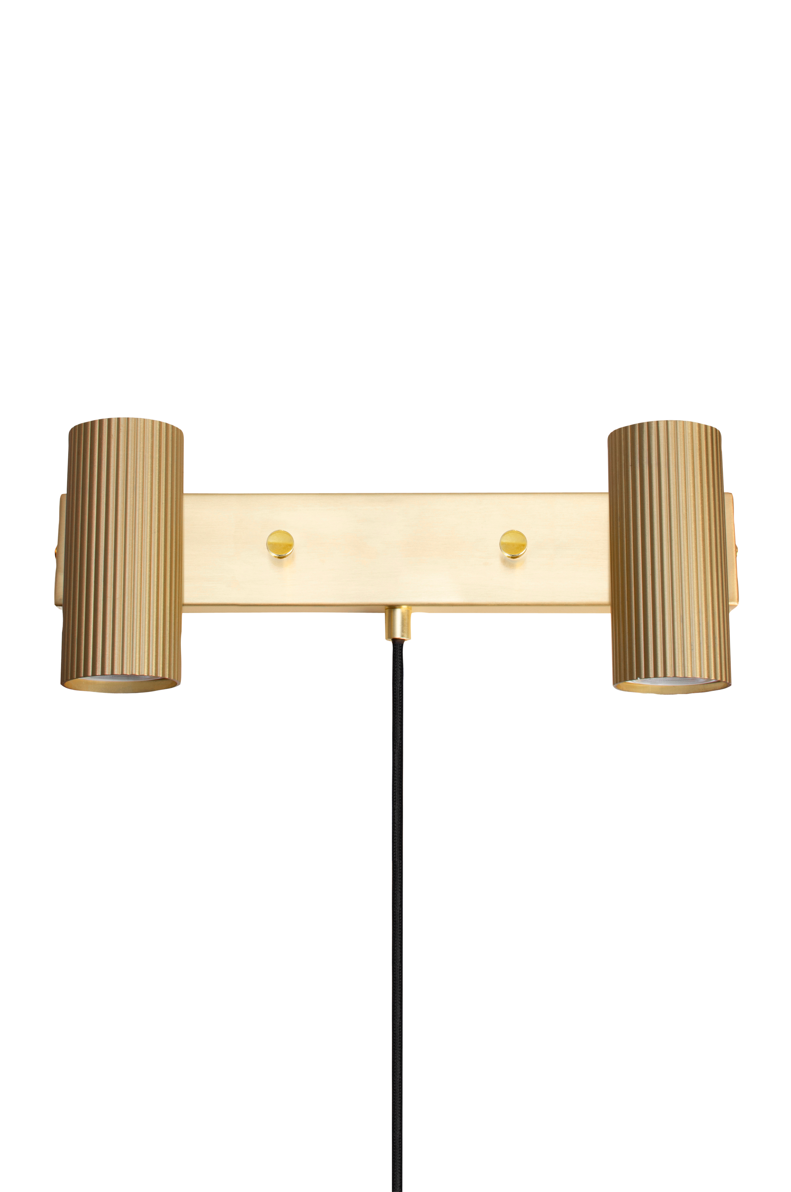Væglampe Hubble 2 Hubble er en moderne væglampe med to rørformede og rillede skærme af metal. Skærmen er justerbar i højden og til siden. Lampen har en 200 cm lang stofledning med stik. Kontakterne er placeret på vægpladen (tænd/sluk, ikke lysdæmper). Lampen kan nemt bruges til fast montering, hvis det ønskes. Design: Patrick Hall. Fatning: 2xGU10 28W. Pære medfølger ikke.