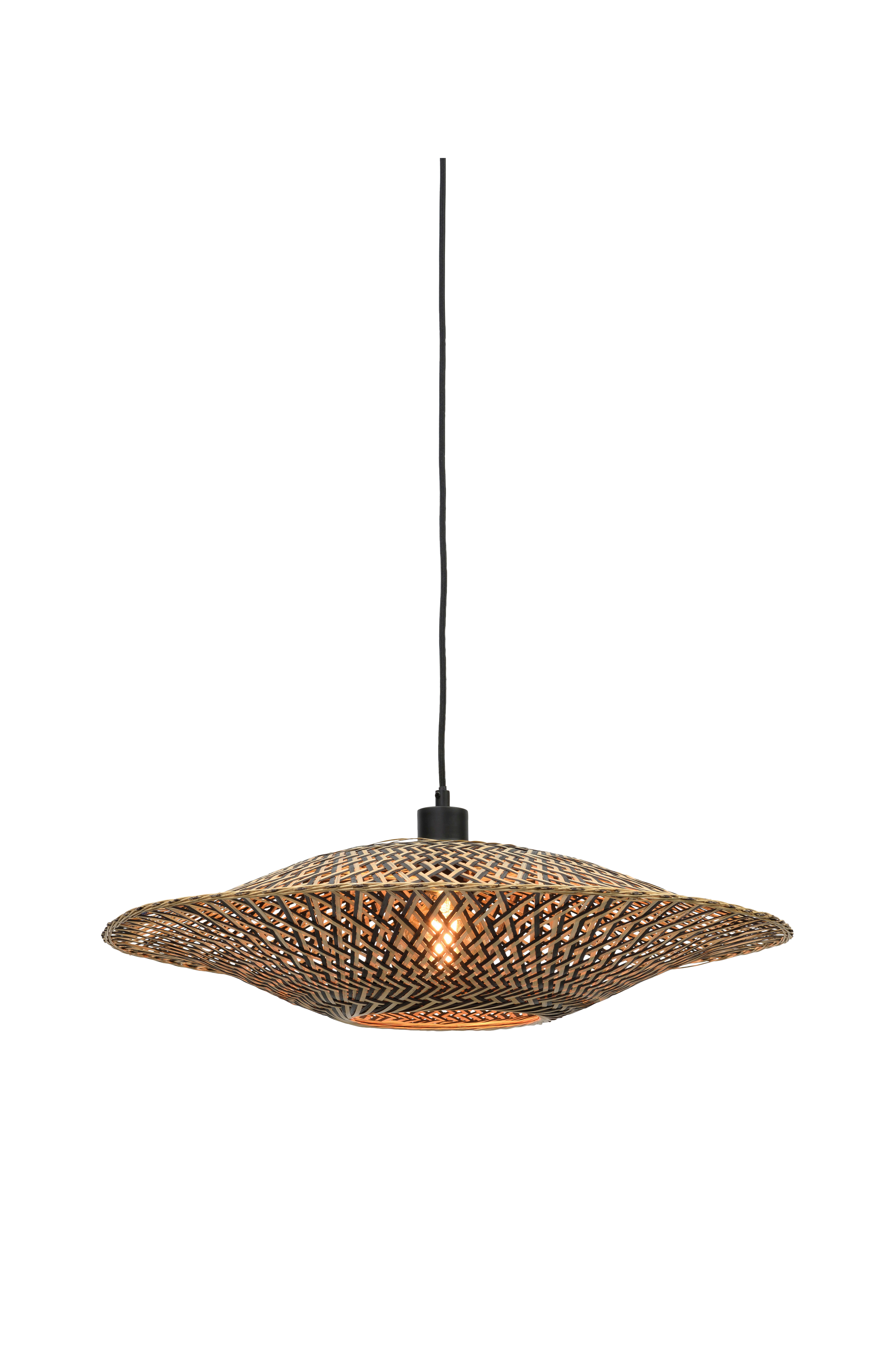 Loftlampe Bali M, lavet af bambus. Højde 15 cm og diameter 60 cm. Maks. 40 W. E27-sokkel. Lyskilde og loftstik medfølger ikke. Jord.