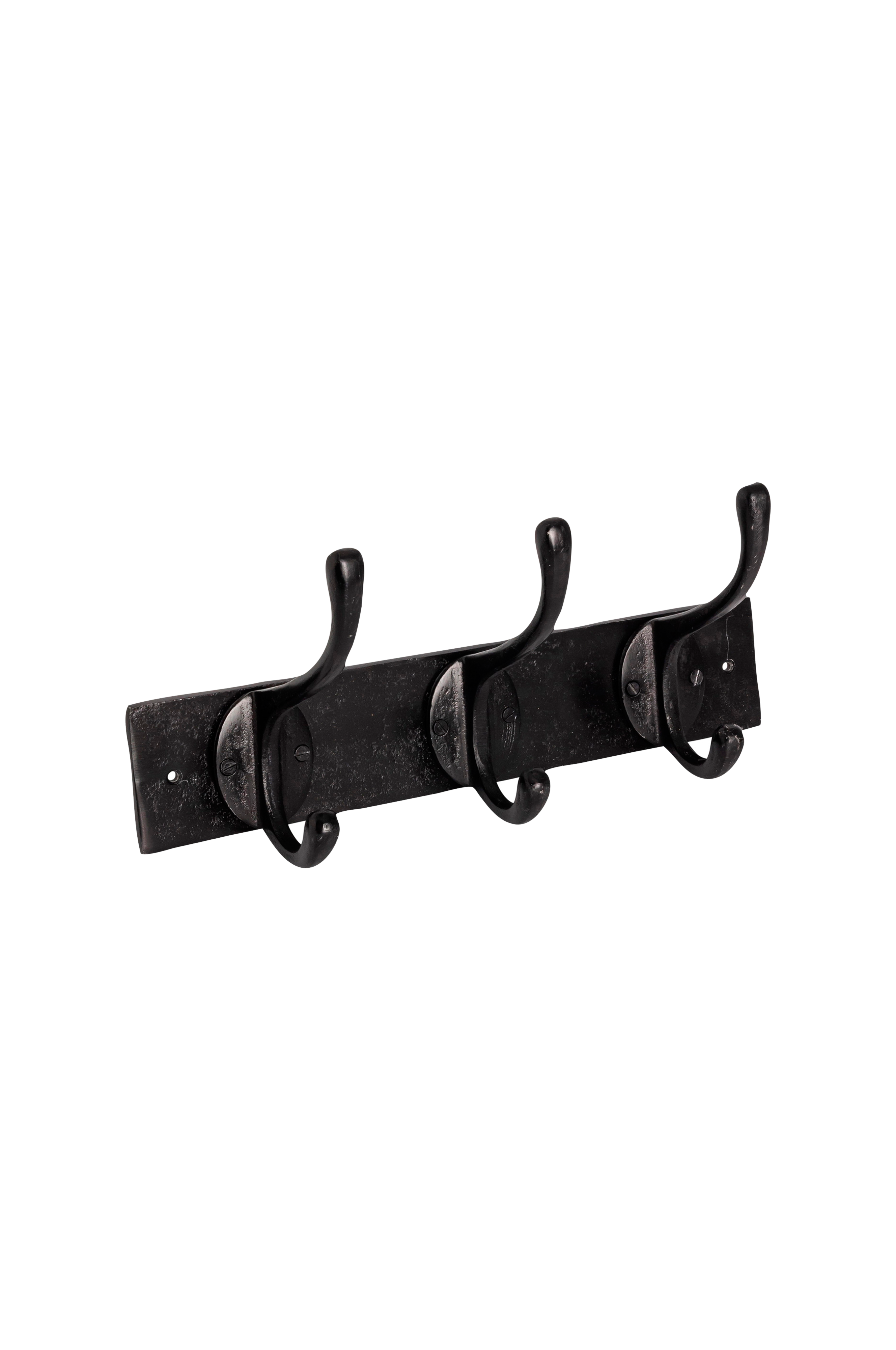 Knagerække i metal med en mørk, rustik finish og vintageinspireret design. Nogle træsorter kan reagere på metalkontakt og udvikle mørke mærker. Tjek tolerancen for din overflade, før du placerer produktet i direkte kontakt.