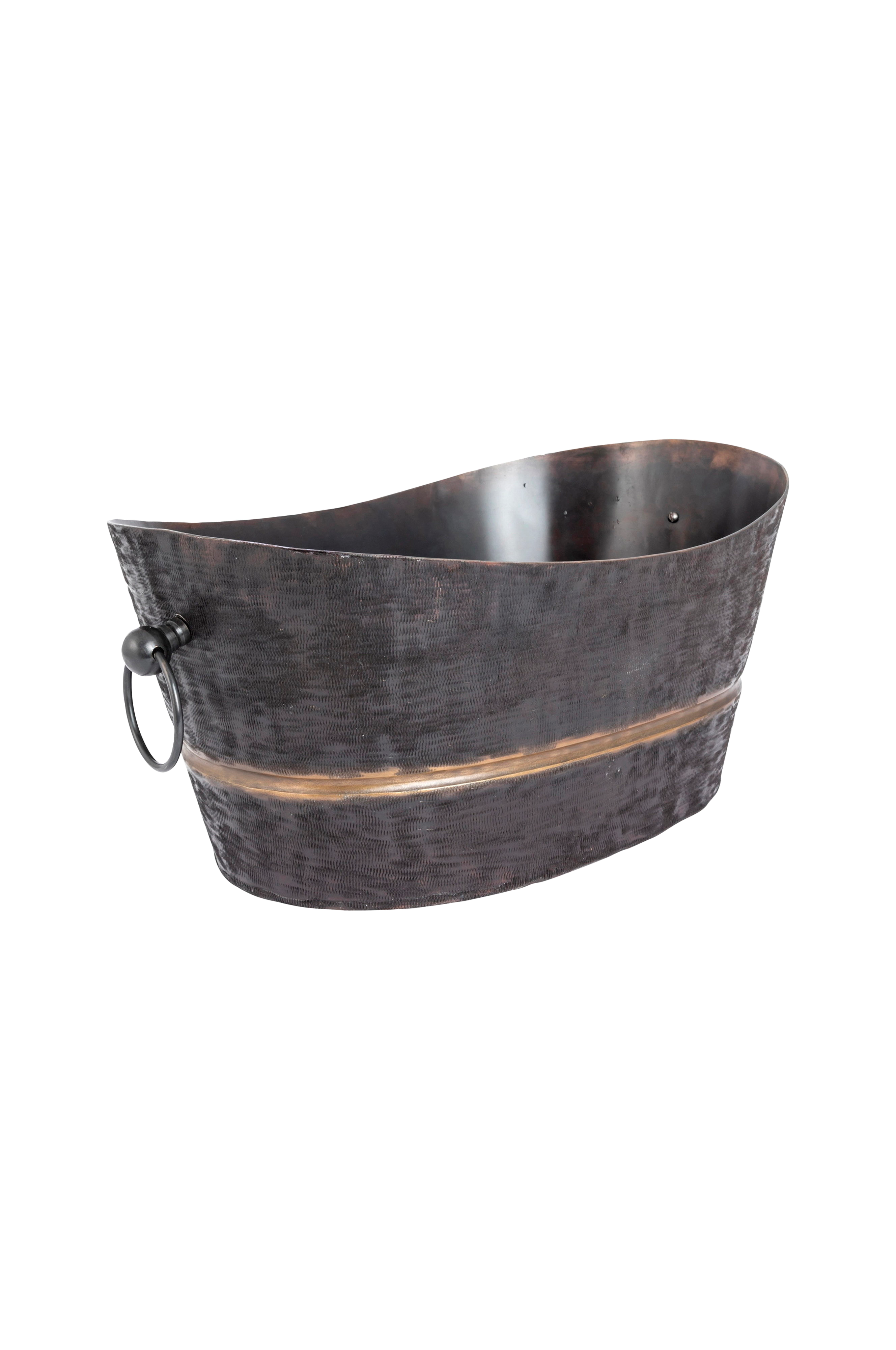 Kimberley champagnekøler i mørkt, struktureret metal med en elegant gylden stribe og håndtag på hver side giver et sofistikeret præg til enhver fest. Perfekt til at holde champagnen på køl og samtidig give borddækningen et luksuriøst præg.håndtag på begge sider. Bemærk: Nogle træsorter kan reagere, når de kommer i kontakt med metal, og efterlade mørke mærker. Sørg for, at din overflade kan tåle dette, før du placerer produktet direkte på træoverflader.