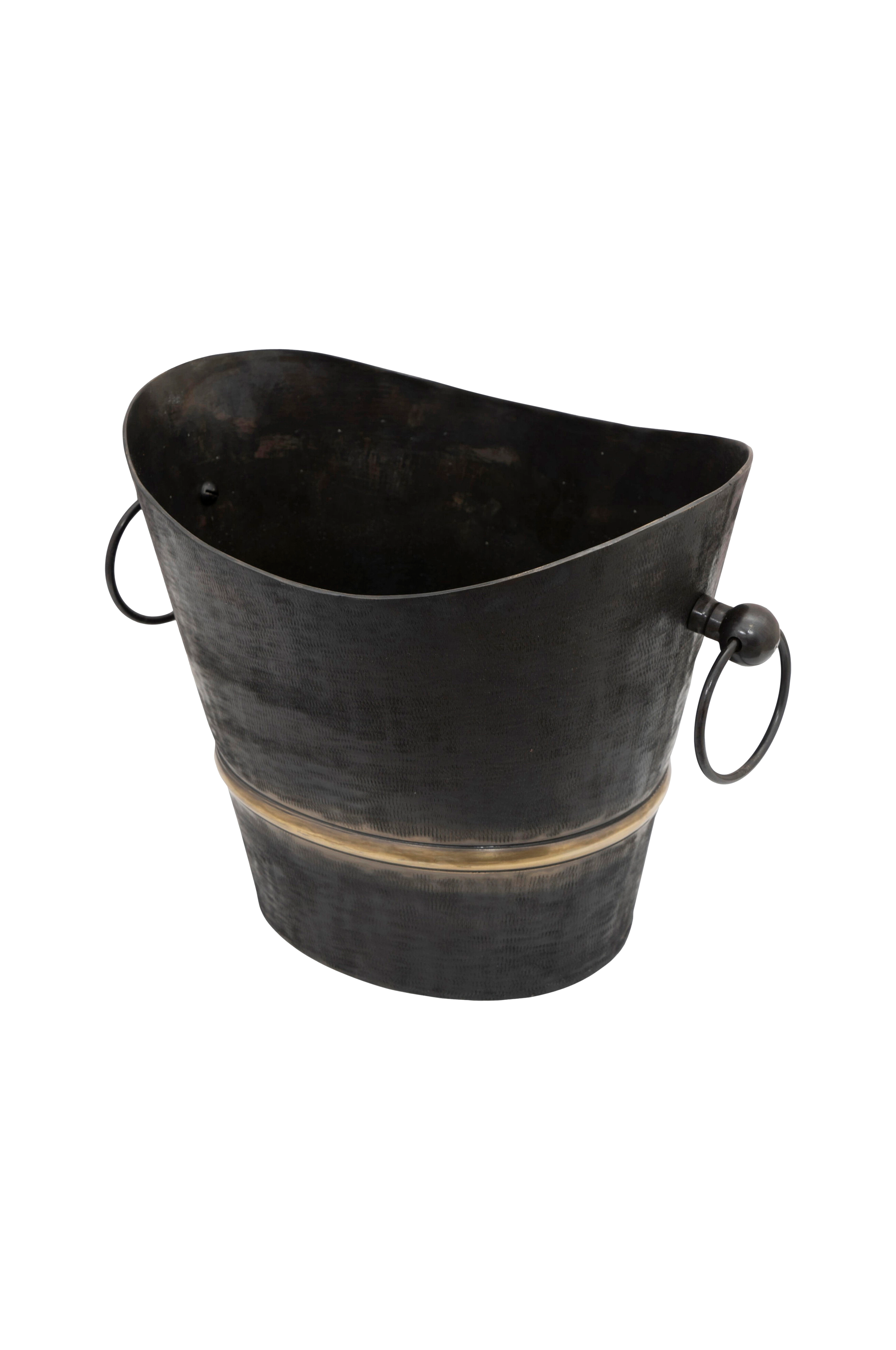 Kimberley champagnekøler i mørkt, struktureret metal med en elegant gylden stribe og håndtag på hver side giver et sofistikeret præg til enhver fest. Perfekt til at holde champagnen afkølet og samtidig give borddækningen et luksuriøst præg. Håndtag på begge sider. Bemærk: Nogle træsorter kan reagere, når de kommer i kontakt med metal, og efterlade mørke mærker. Sørg for, at din overflade kan tåle dette, før du placerer produktet direkte på træoverflader.