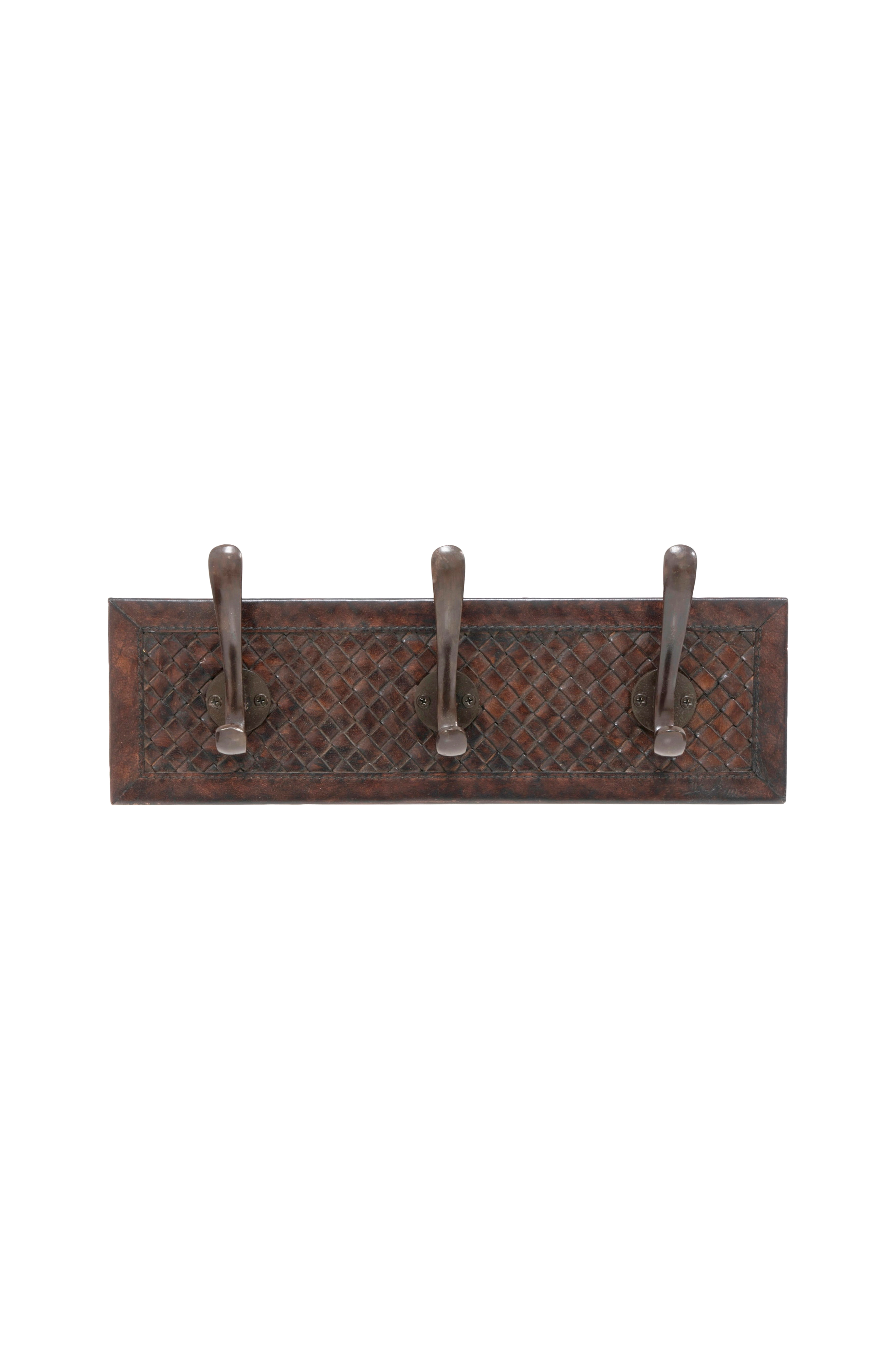 Denne elegante læderknagerække med et smukt vævet mønster giver din entré et sofistikeret og luksuriøst præg. Den gyldenbrune tone komplementerer moderne interiør og blander både funktion og stil. 3 kroge. Ægte læder.