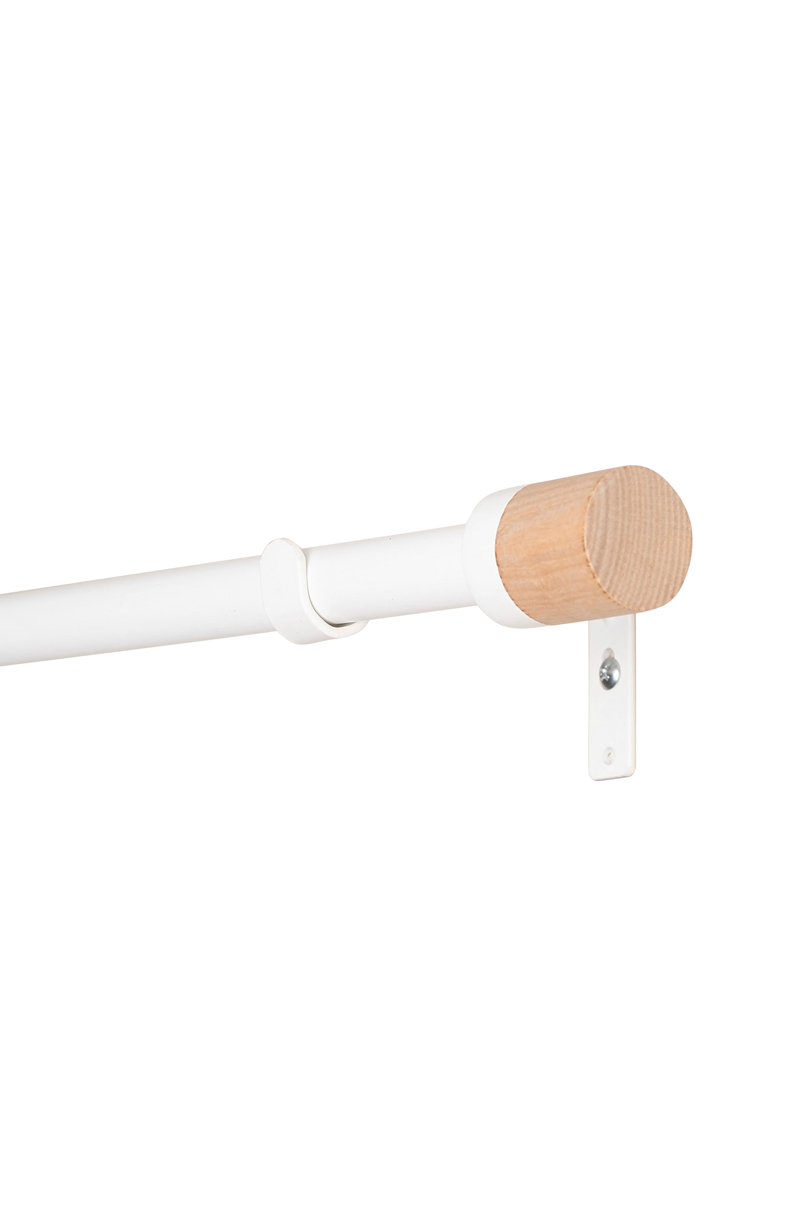 Komplet gardinstang i metal (16/19 mm) med dekorative finials i træ. Sættet indeholder justerbare stænger (110-200 cm), 2 finials og 3 justerbare vægbeslag (7-9 cm).
