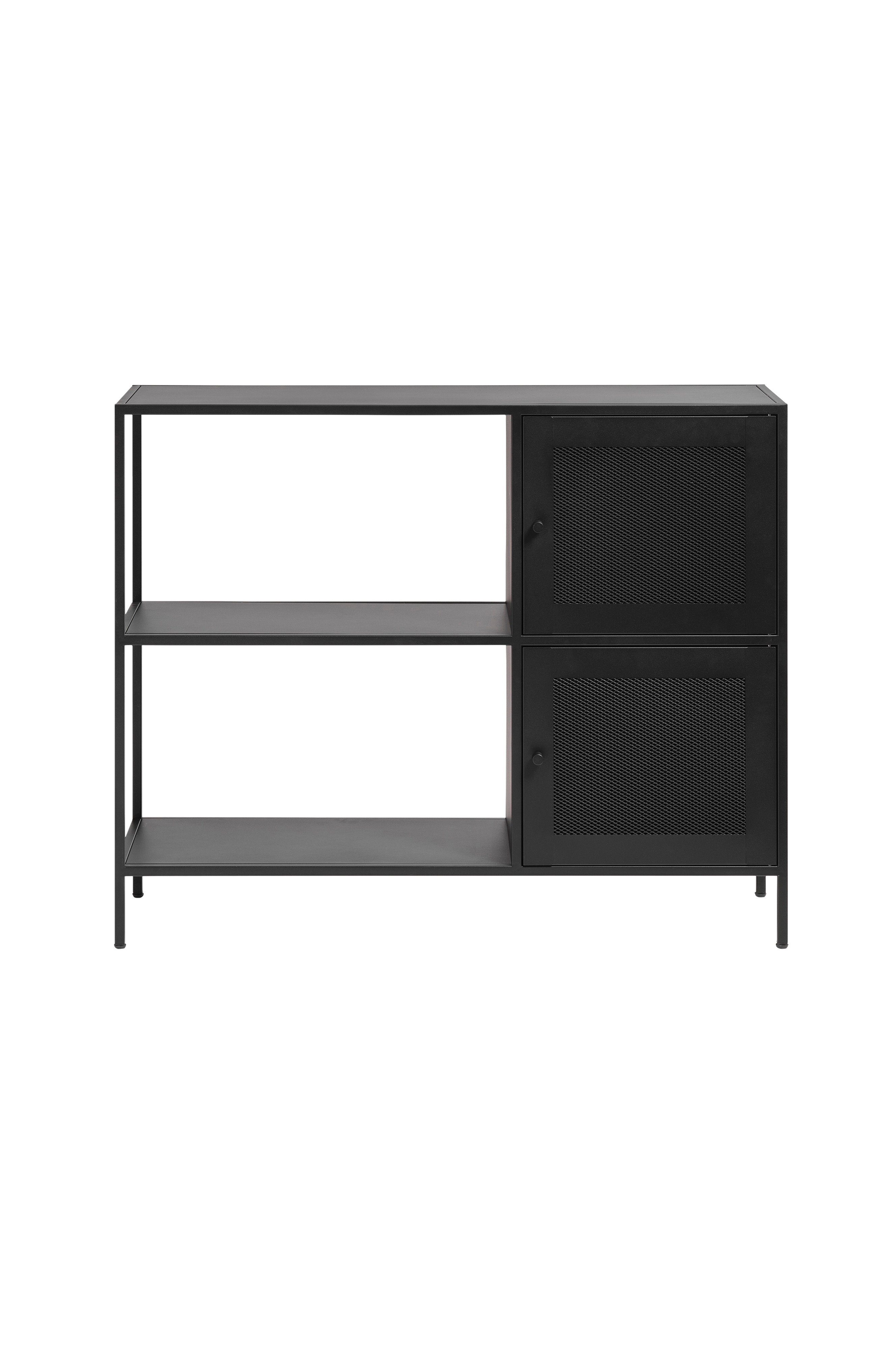 Lige linjer og industrielle elementer med sort metal og indsatser af sort metalnet giver Petra en moderne og stilfuld fornemmelse, der passer perfekt ind i ethvert rum, der har brug for et ekstra opbevaringsmøbel.