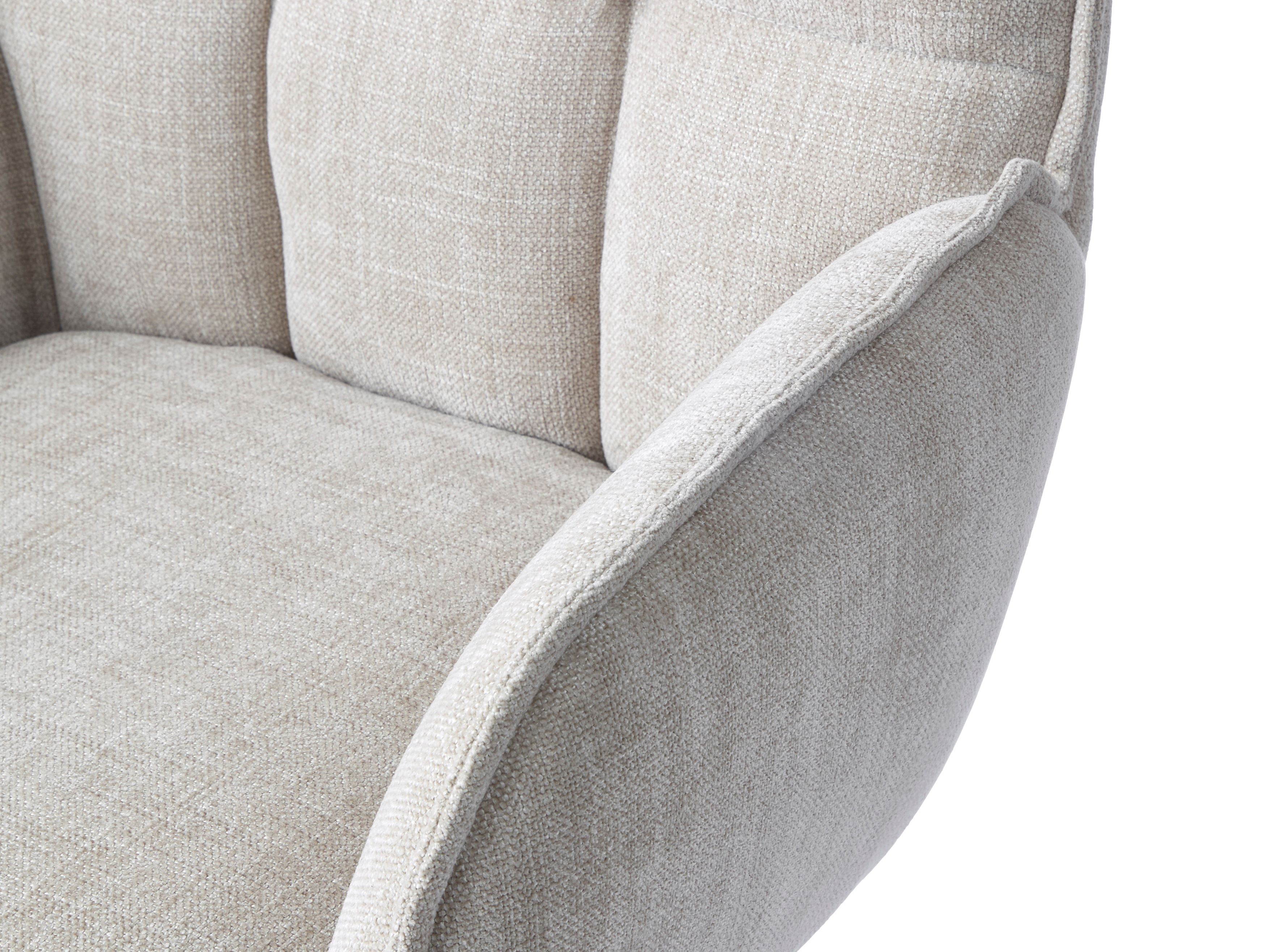 Stolen er betrukket med stof, fremstillet af 100 % polyester, som giver både komfort og holdbarhed. De drejelige ben tilføjer et moderne, funktionelt touch til det slanke design. Stolen tilfører elegance og stil til ethvert rum, hvilket gør den til et blikfang i moderne indretninger.