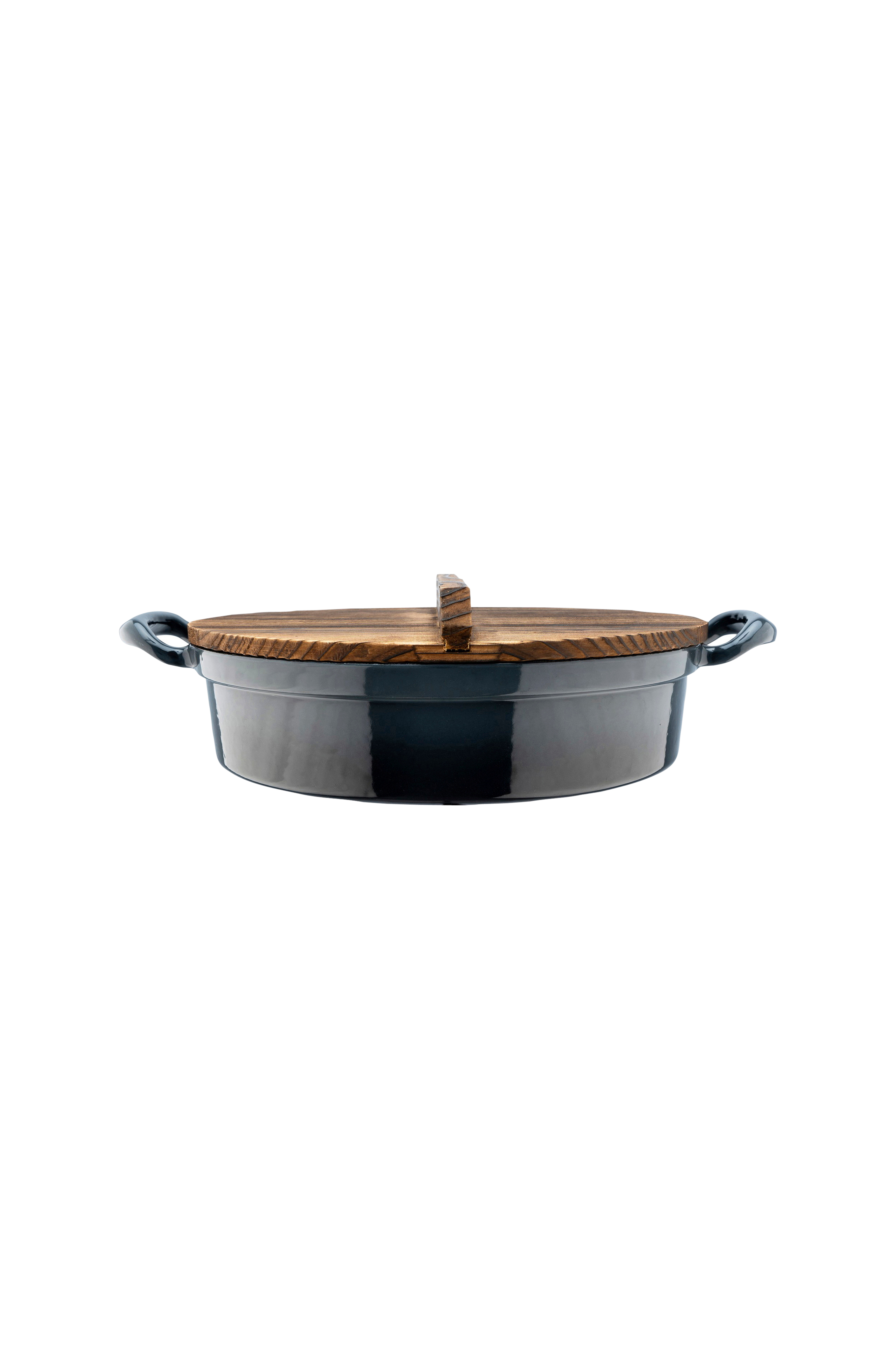 Dutch oven i emaljeret støbejern med robuste træhåndtag og et stort ørehåndtag. Gryden er 30 cm i diameter og 11 cm høj. Ydersiden er emaljeret, mens indersiden har en mat emaljebelægning. Gryden leveres med et smukt trælåg.