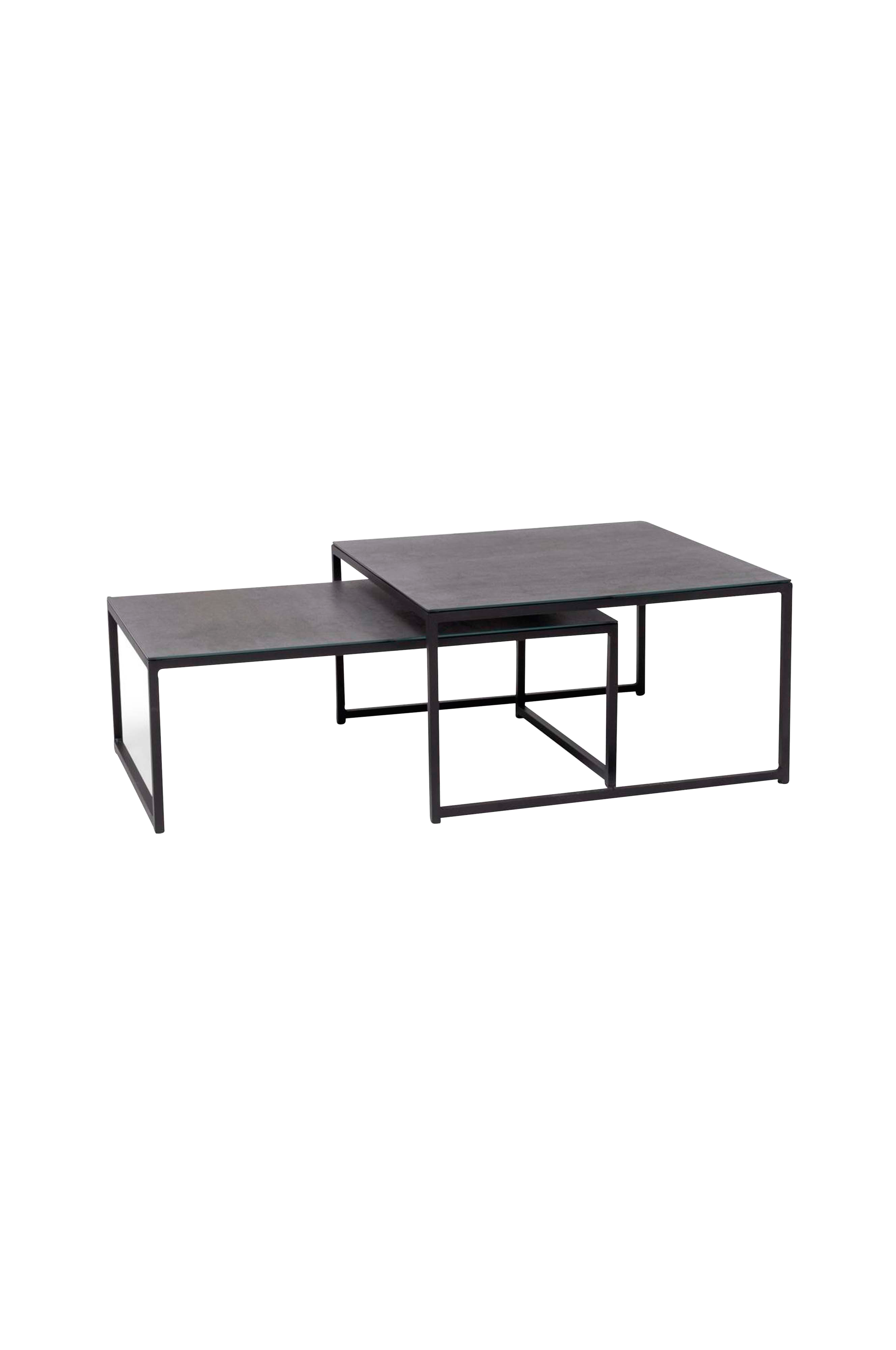 Nest af borde med beige aluminiumsstel og bordplade af gråt keramisk glas. Mål: højt bord 80x80x45 cm, lavt bord 100x60x37 cm.
