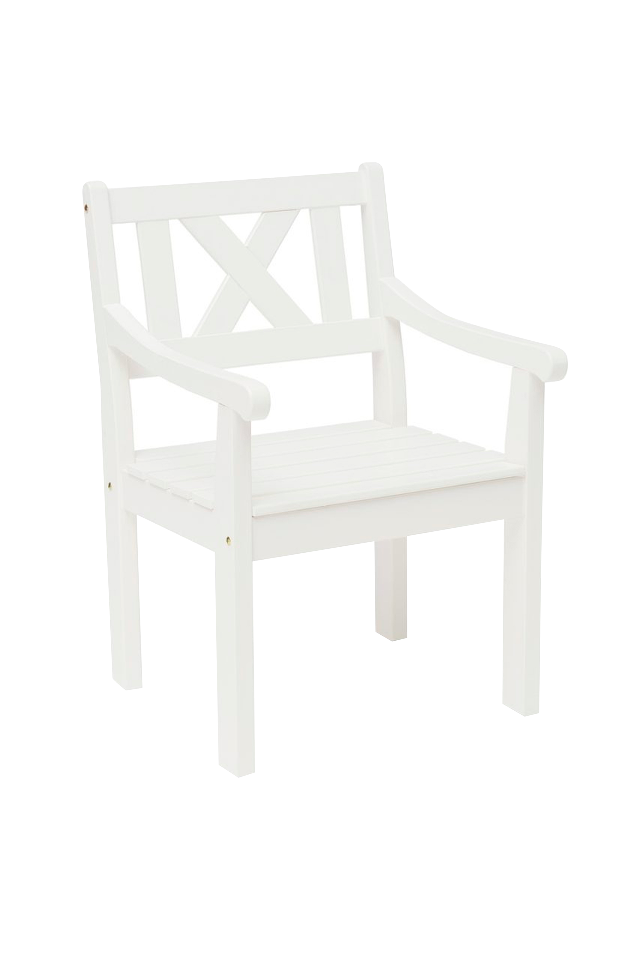 En klassisk lænestol i hvidlakeret, mærket fyrretræ.