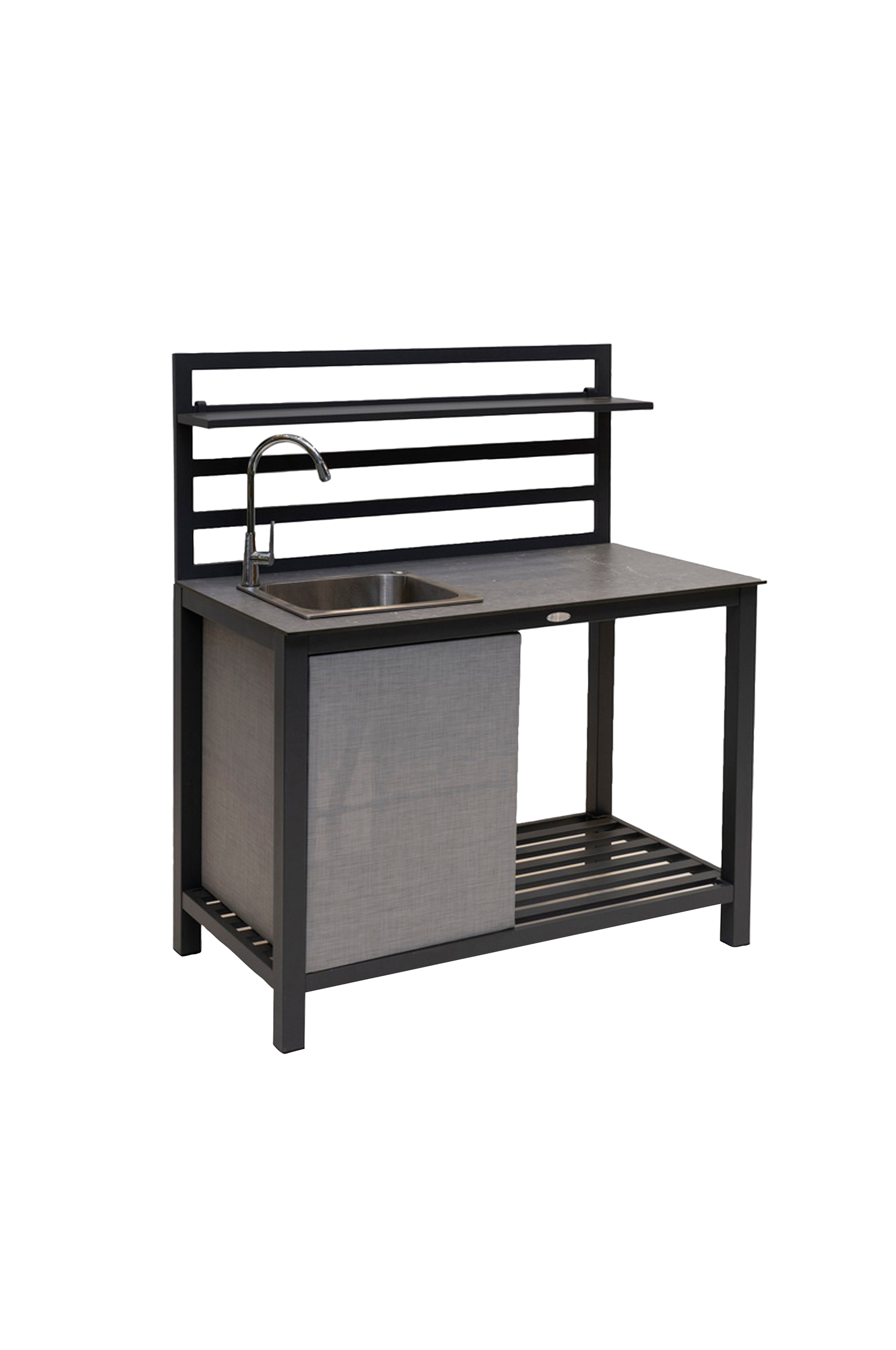Hvem vil ikke lave mad under åben himmel? Sommerens must og festens absolutte midtpunkt er udekøkkenet! Et komplet stilrent udekøkken indeholdende grå aluminiumsramme, grå hylde, gråmeleret bordplade, vask og tekstilbetræk. Klar til at tilslutte haveslangen. Delen med vask og vandhane medfølger.