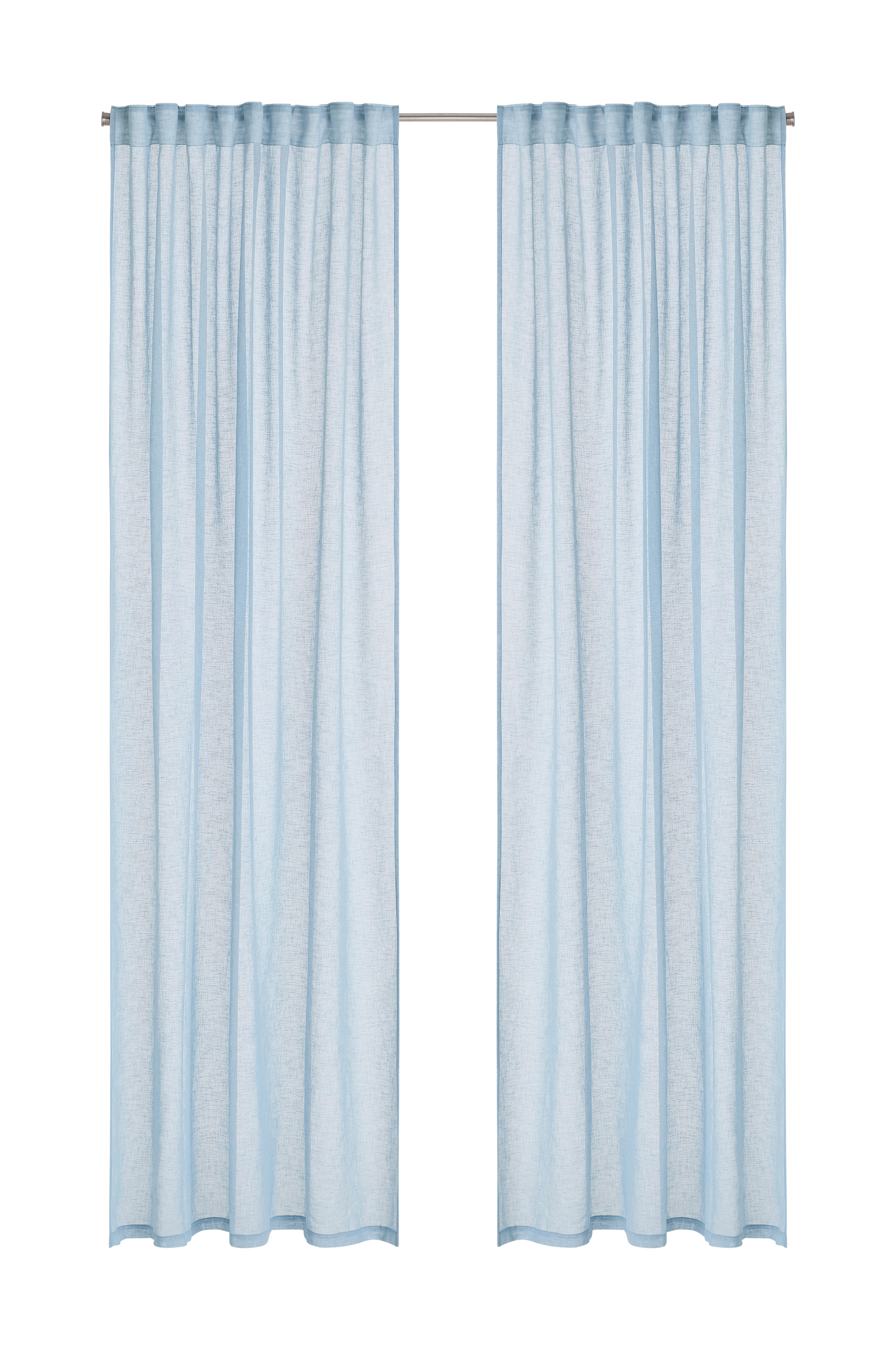 To multibåndsgardiner i løst vævet hørlook i blød, genindvundet polyester. Multibåndet gør, at du enten kan hænge gardinerne direkte på en gardinstang gennem de skjulte stropper eller anvende ringe, nålekroge eller fingerkroge. Snoren i rynkebåndet gør, at du let kan skabe ensartede, flotte læg.