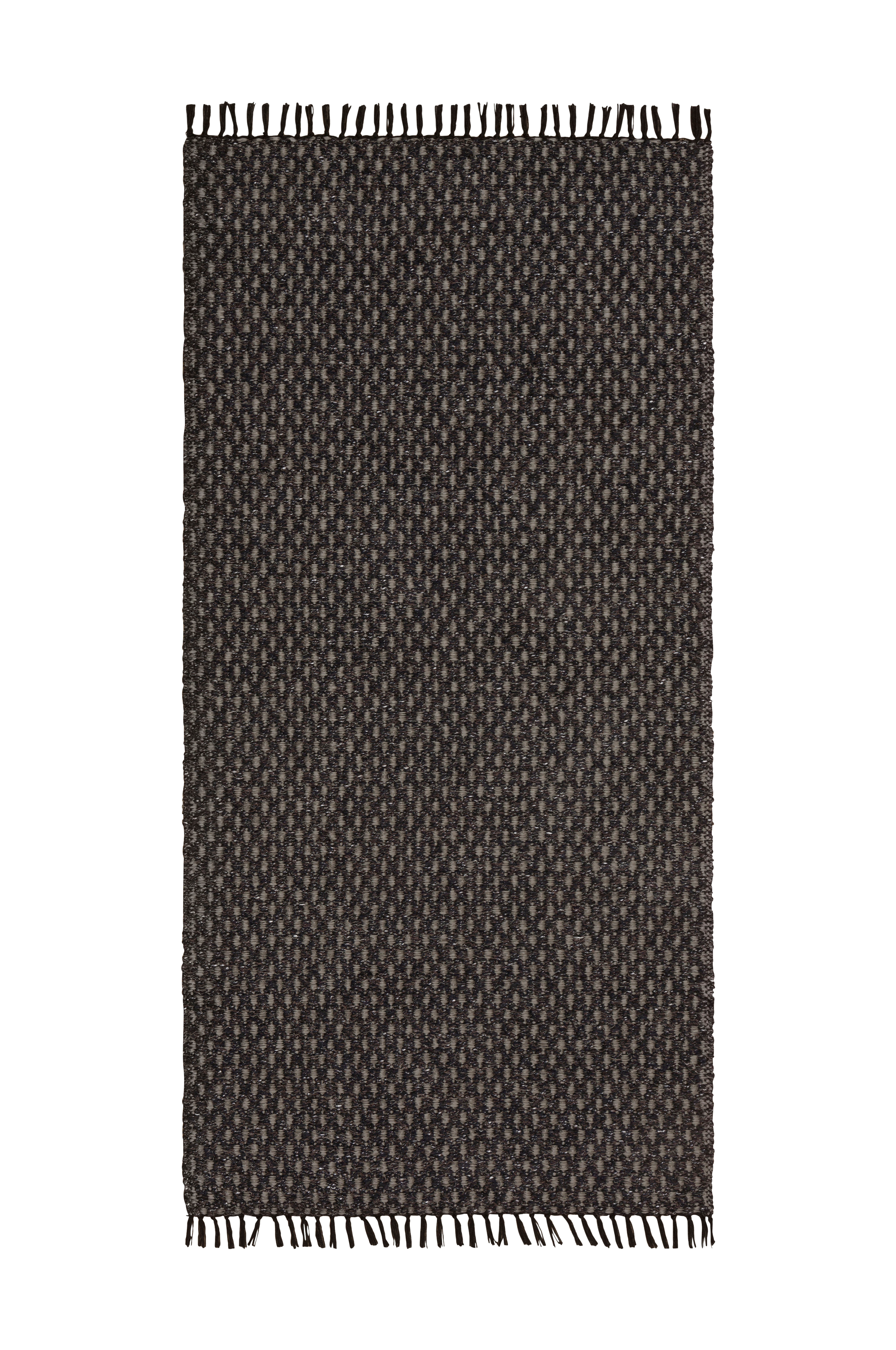 Tyk og blød. Behagelig at gå/stå på. Ikke helt sort, men spættet med grå og lidt hvid