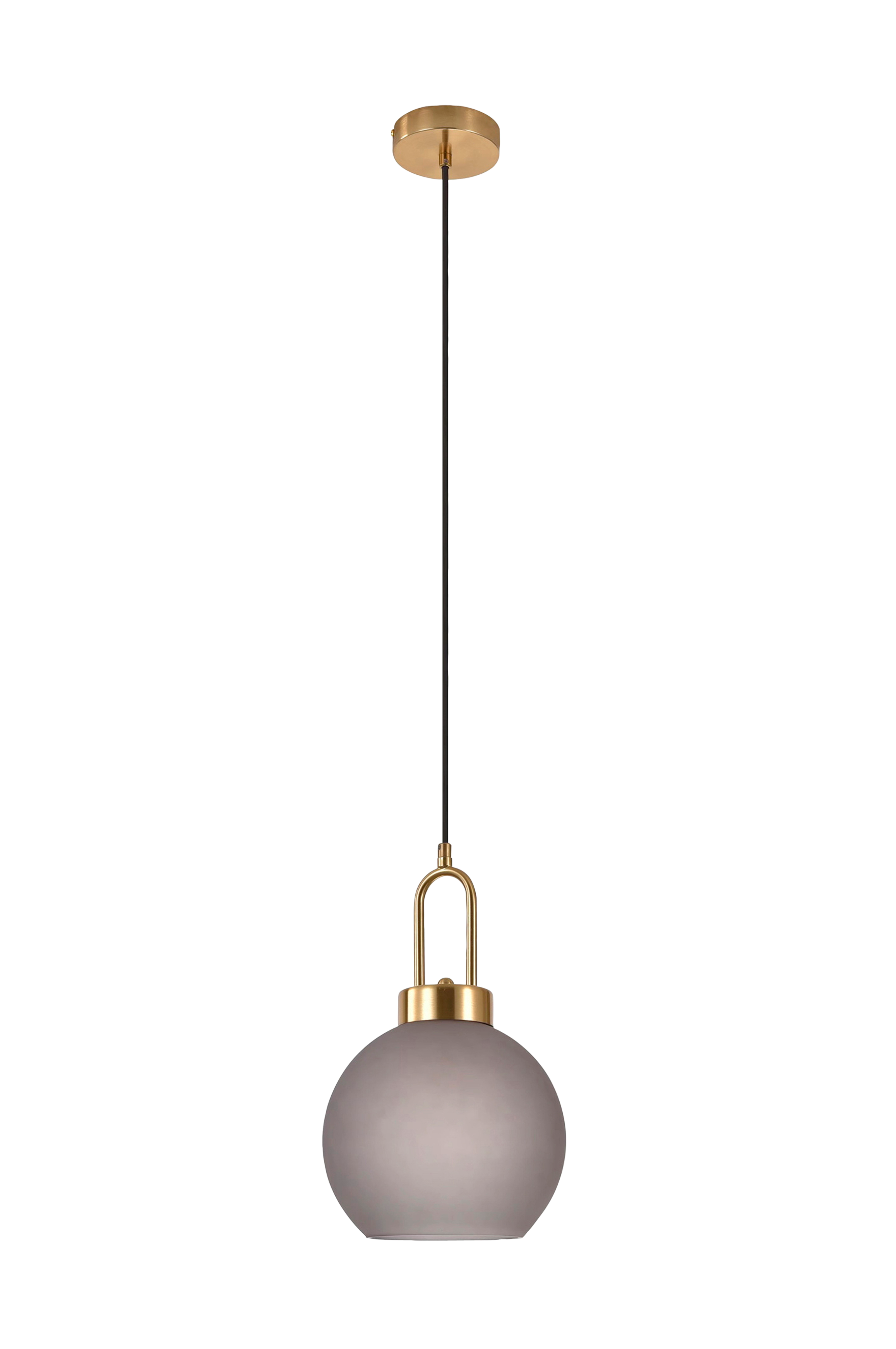 Loftlampe af glas, messingfarvet sokkel, kugleformet, diameter 25 cm, 150 cm stofledning