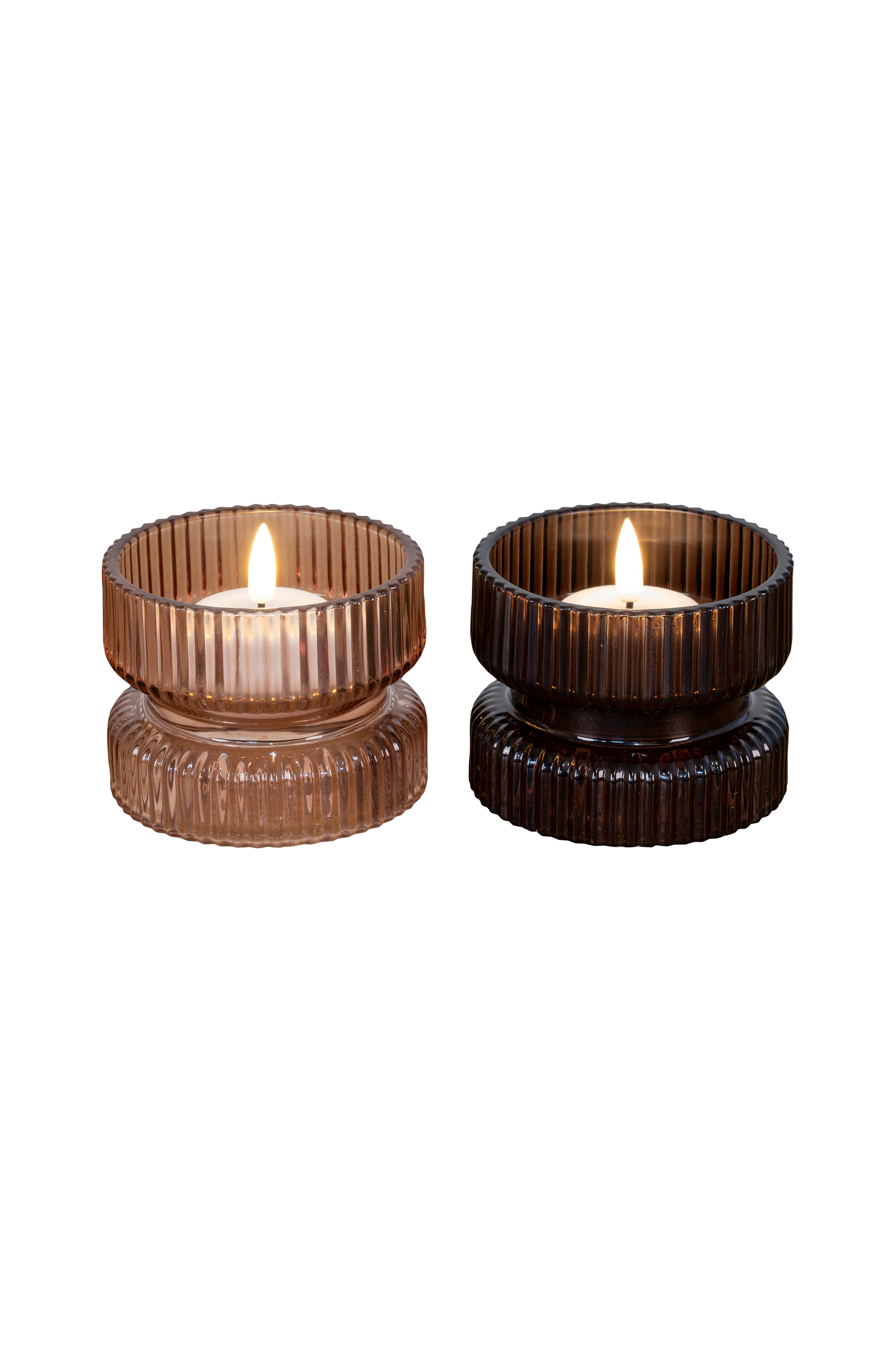 Vendbar lysestage i glas til fyrfadslys og bloklys. Mål: Diameter 9 x H7 cm.