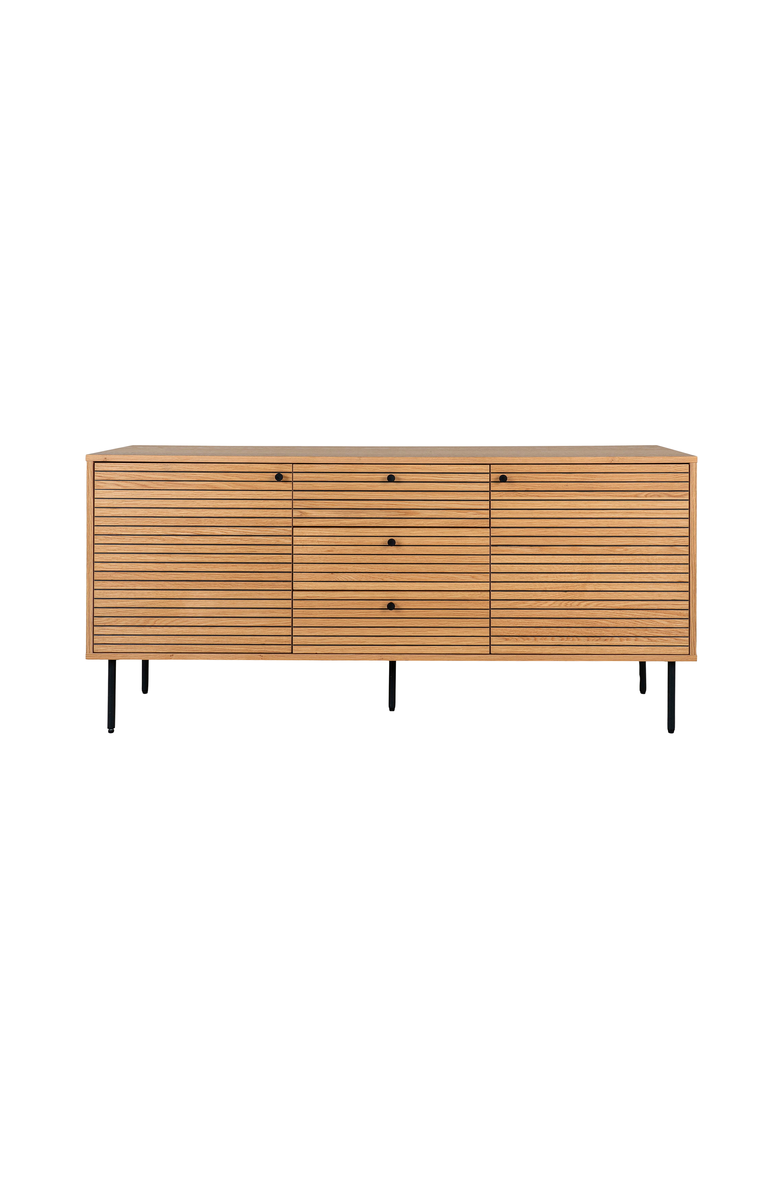 Skænk, egefinér, sorte metalben, 3 skuffer og 2 låger, 150x40x74 cm
