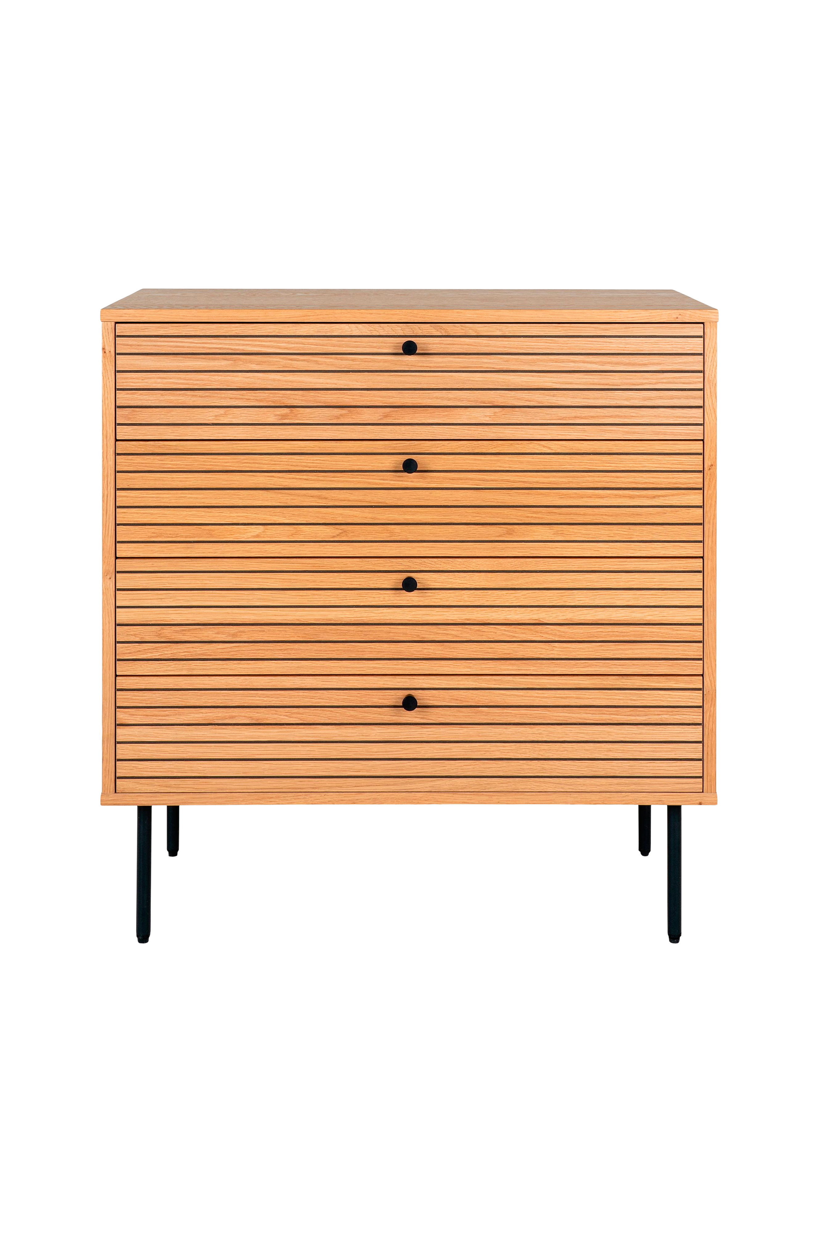 Kommode, egefinér, sorte metalben, 4 skuffer, 80x40x85 cm