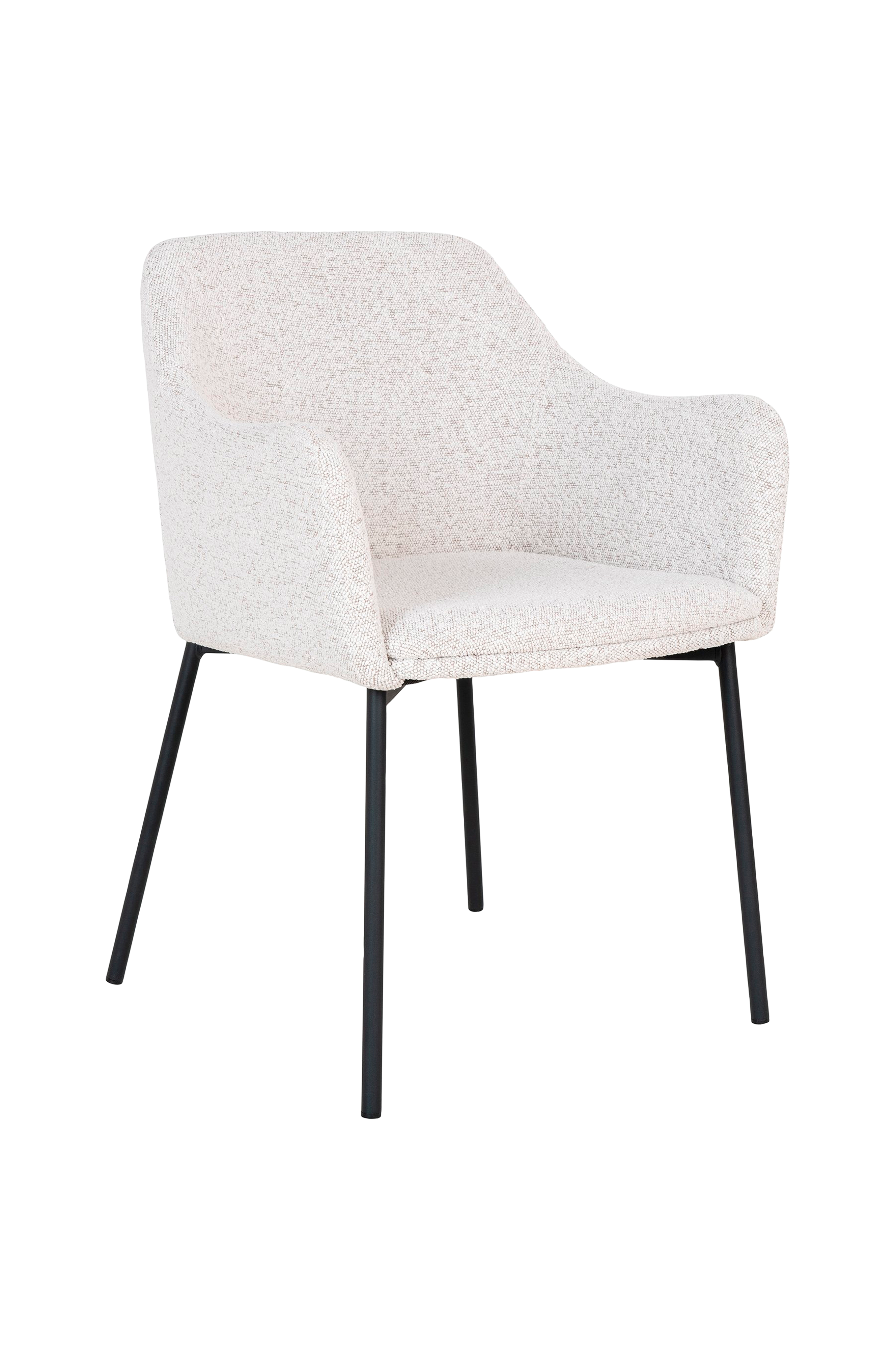 Spisebordsstol, hvid bouclé med sorte ben. Mål fra gulv til armlæn er 65 cm.